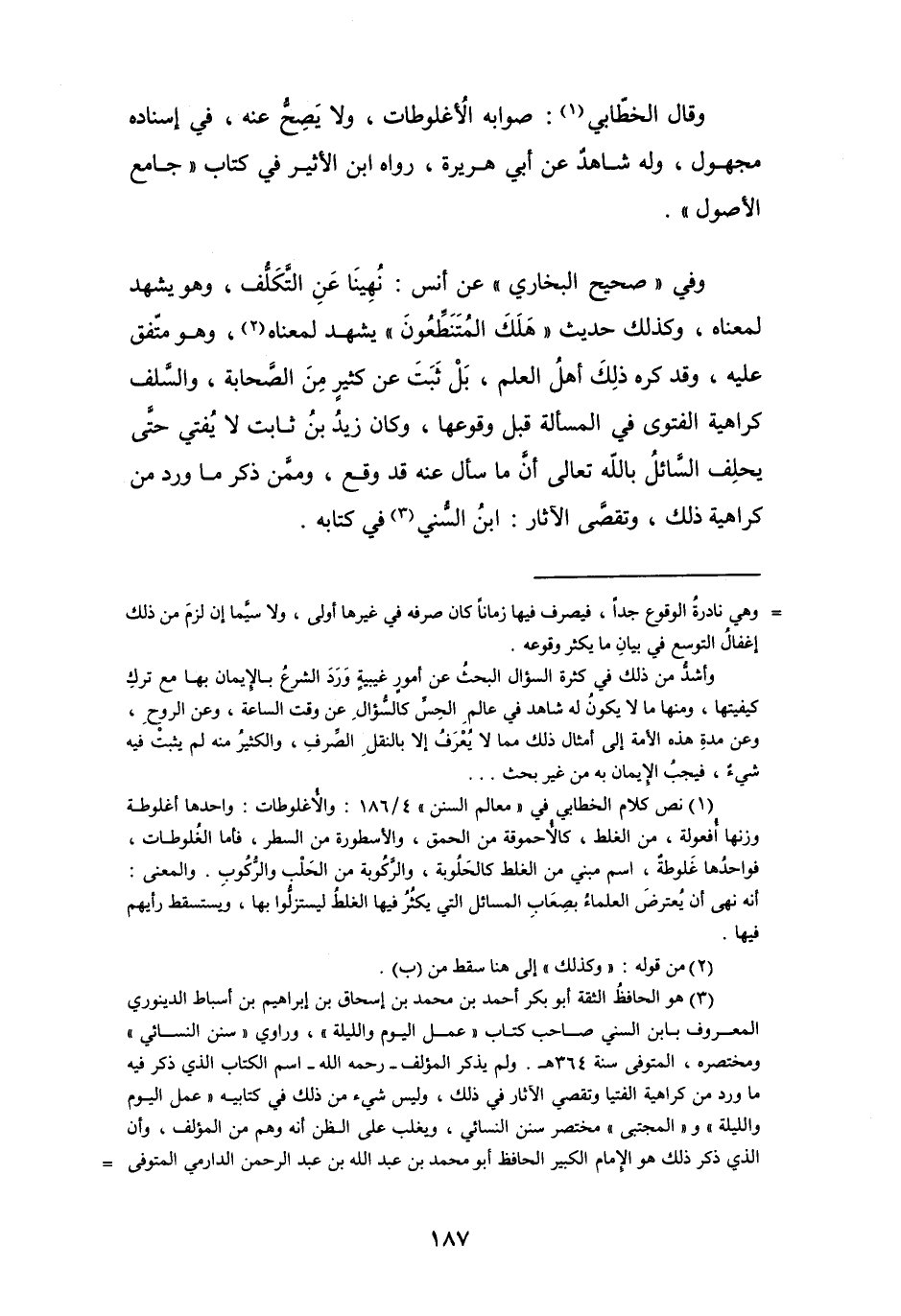 (¬1) نص كلام الخطابي في " معالم السنن " 4/ 186: والأُغلوطات: واحدها أغلوطة وزنها أُفعولة، من الغلط، كالأُحموقة من الحمق، والأسطورة من السطر، فأما الغُلوطات، فواحدُها غَلوطةٌ، اسم مبني من الغلط كالحَلُوبة، والرَّكُوبة من الحَلْب والرُّكوب. والمعنى: أنه نهى أن يُعترضَ العلماء بصِعَابِ المسائل التي يكثُرُ فيها الغلطُ ليستزلُّوا بها، ويستسقط رأيهم فيها.