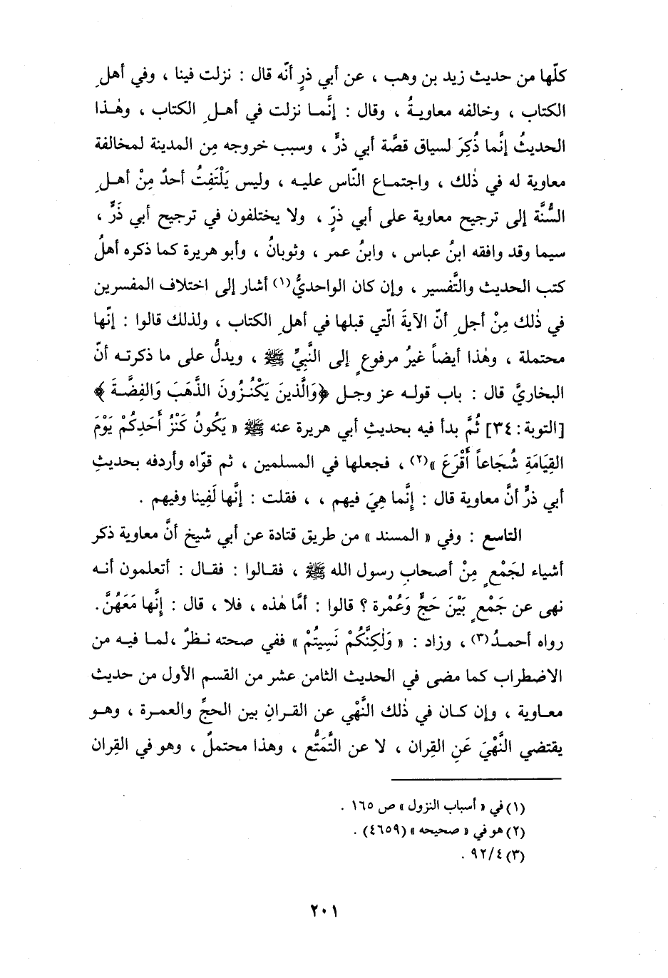 كلّها من حديث زيد بن وهب، عن أبي ذرٍ أنّه قال: نزلت فينا، وفي أهلِ الكتاب، وخالفه معاويةُ، وقال: إنَّما نزلت في أهلِ الكتاب، وهذا الحديثُ إنَّما ذُكِرَ لسياق قصَّة أبي ذرٍّ، وسبب خروجه من المدينة لمخالفة معاوية له في ذلك، واجتماع النّاس عليه، وليس يَلْتَفِتُ أحدٌ مِنْ أهلِ السُّنَّة إلى ترجيح معاوية على أبي ذرٍّ، ولا يختلفون في ترجيح أبي ذَرٍّ، سيما وقد وافقه ابنُ عباس، وابنُ عمر، وثوبانُ، وأبو هريرة كما ذكره أهلُ كتب الحديث والتَّفسير، وإن كان الواحديُّ (¬1) أشار إلى اختلاف المفسرين في ذلك مِنْ أجلِ أنّ الآية الّتي قبلها في أهل الكتاب، ولذلك قالوا: إنّها محتملة، وهذا أيضاً غيرُ مرفوعٍ إلى النَّبِيِّ - صلى الله عليه وسلم -، ويدلُّ على ما ذكرته أنّ البخاريَّ قال: باب قوله عز وجل {وَالَّذِينَ يَكْنِزُونَ الذَّهَبَ وَالْفِضَّةَ} [التوبة: 34] ثمَّ بدأ فيه بحديثِ أبي هريرة عنه - صلى الله عليه وسلم - " يَكُونُ كَنْزُ أحَدِكمْ يَوْمَ القيَامَةِ شُجَاعاً أقْرَعَ " (¬2)، فجعلها في المسلمين، ثم قوّاه وأردفه بحديثِ أبي ذرِّ أنَّ معاوية قال: إِنَّما هِيَ فيهم، فقلت: إنَّها لَفِينا وفيهم.