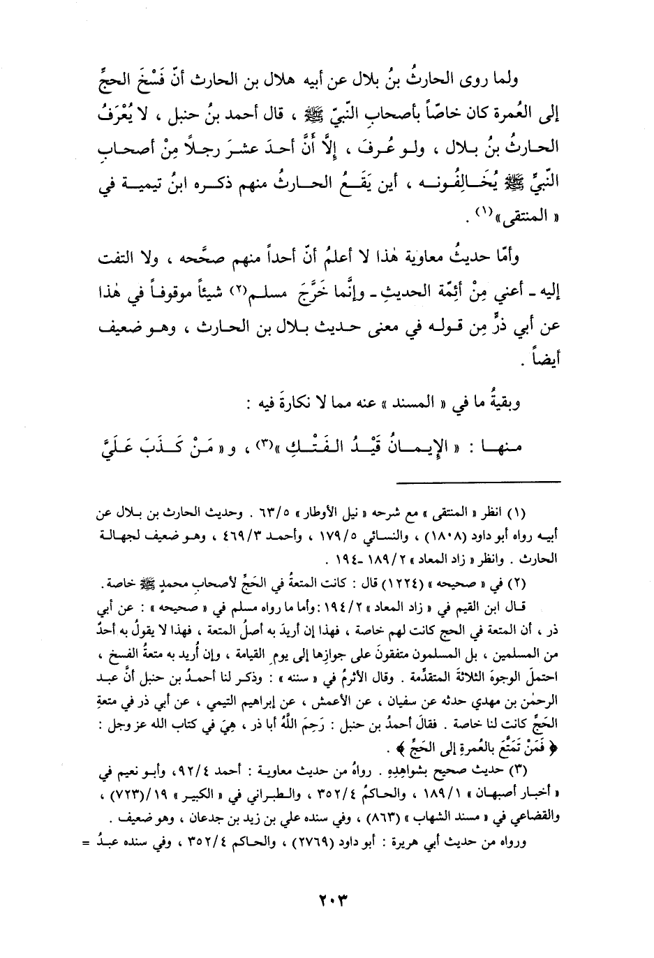 (¬1) انظر " المنتقى " مع شرحه " نيل الأوطار " 5/ 63. وحديث الحارث بن بلال عن أبيه رواه أبو داود (1808)، والنسائي 5/ 179، وأحمد 3/ 469، وهو ضعيف لجهالة الحارث. وانظر " زاد المعاد " 2/ 189 - 194.