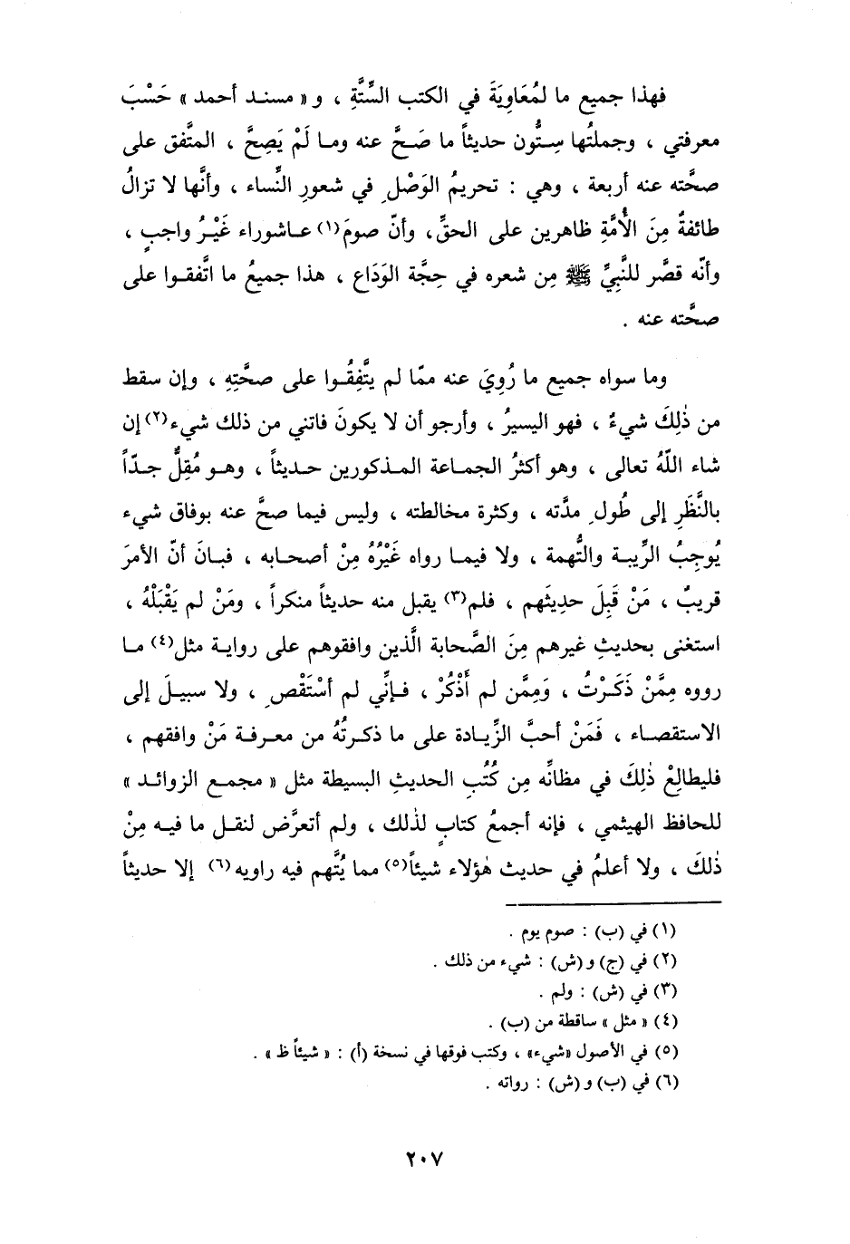 وما سواه جميع ما رُوِيَ عنه ممّا لم يتَّفِقُوا على صحَّتِهِ، وإن سقط من ذلِكَ شيءٌ، فهو اليسيرُ، وأرجو أن لا يكونَ فاتني من ذلك شيء (¬2) إن شاء اللهُ تعالى، وهو أكثرُ الجماعة المذكورين حديثاًً، وهو مُقِلٌّ جداً بالنَّظَرِ إلى طُولِ مدَّته، وكثرة مخالطته، وليس فيما صحَّ عنه بوفاق شيء يُوجِبُ الرِّيبة والتُّهمة، ولا فيما رواه غَيْرُهُ مِنْ أصحابه، فبان أنّ الأمر قريبٌ، مَنْ قبِلَ حدِيثَهم، فلم (¬3) يقبل منه حديثاً منكراً، ومَنْ لم يَقْبَلْهُ، استغنى بحديثِ غيرهم مِنَ الصَّحابة الَّذين وافقوهم على رواية مثل (¬4) ما رووه مِمَّنْ ذَكَرْتُ، وَمِمَّن لم أذْكُرْ، فإنِّي لم أسْتَقْصِ، ولا سبيلَ إلى الاستقصاء، فَمَنْ أحبَّ الزِّيادة على ما ذكرتُهُ من معرفة مَنْ وافقهم، فليطالِعْ ذلِكَ في مظانِّه مِن كُتُبِ الحديثِ البسيطة مثل " مجمع الزوائد " للحافظ الهيثمي، فإنه أجمعُ كتابٍ لذلك، ولم أتعرَّض لنقل ما فيه مِنْ ذلكَ، ولا أعلمُ في حديث هؤلاء شيئاً (¬5) مما يُتَّهم فيه راويه (¬6) إلا حديثاًً
