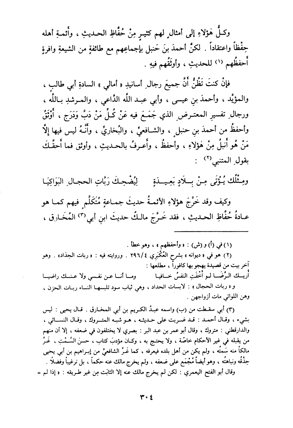 وكلُّ هؤلاءِ إلى أمثالٍ لهم كثيرٍ مِنْ حُفَّاطِ الحديثِ، وأئمةِ أهله حِفْظاً واعتقاداً. لكنَّ أحمدَ بن حَنبل بإجماعهم مع طائفةٍ من الشيعةِ وافرةٍ أحفظُهم (¬1) للحديثِ، وأوثَقُهم فيهِ.