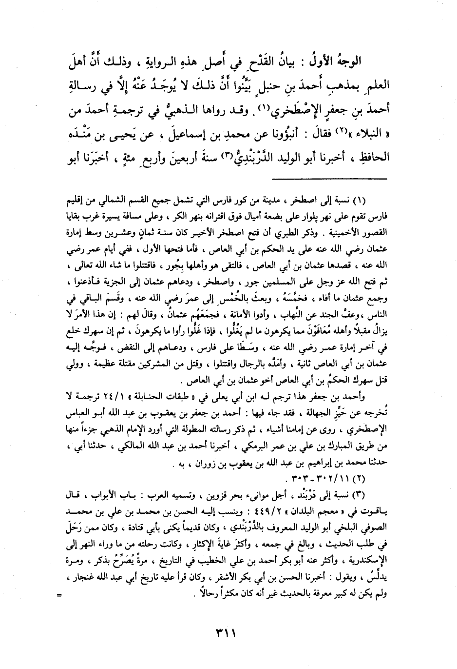 الوجهُ الأولُ: بيانُ القَدْح في أصلِ هذه الروايةِ، وذلك أنَّ أهلَ العلمِ بمذهبِ أحمدَ بنِ حنبل بَيَّنُوا أنَّ ذلكَ لا يُوجَدُ عَنْهُ إلاَّ في رسالةِ أحمدَ بنِ جعفرٍ الإصْطَخري (¬1). وقد رواها الذهبيُّ في ترجمةِ أحمدَ من " النبلاء " (¬2) فقال: أنبؤُونا عن محمدِ بن إسماعيلَ، عن يَحيى بن منْدَه الحافظِ، أخبرنا أبو الوليد الدَّرْبَنْدِيُّ (¬3) سنةَ أربعينَ وأربعِ مئةٍ، أخبرَنا أبو
