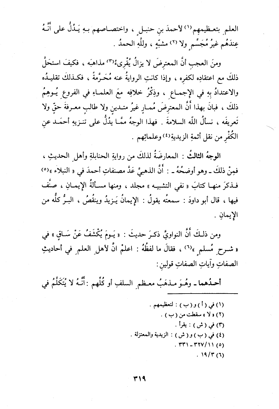 الوجهُ الثالثُ: المعارضةُ لذلكَ من روايةِ الحنابلةِ وأهلِ الحديثِ، فمنْ ذلكَ -وهو أوضحُهُ-: أنَّ الذهبيَّ عَدَّ مصنفاتِ أحمدَ في " النبلاء " (¬5) فذكرَ منها كتابَ " نفي التشبيه " مجلد، ومنها مسألةُ الإِيمانِ، صنَّف فيها، قال أبو داودَ: سمعتُه يقول: الإيمانُ يَزيدُ وينقُصُ، البرُّ كلُّه من الإِيمانِ.