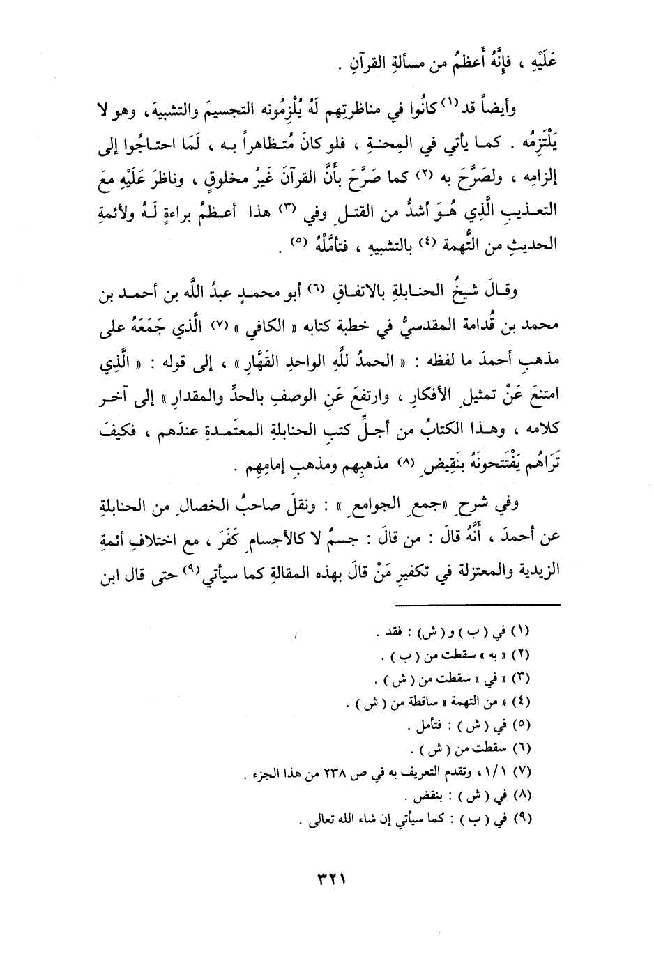 وقالَ شيخ الحنابلةِ بالاتفاقِ (¬6) أبو محمدٍ عبدُ الله بن أحمد بن محمد بن قُدامة المقدسيُّ في خطبة كتابه " الكافي " (¬7) الذي جَمَعَهُ على مذهبِ أحمدَ ما لفظه: " الحمدُ للهِ الواحدِ القَهَّارِ "، إلى قوله: " الذِي امتنعَ عَنْ تمثيلِ الأفكارِ، وارتفعَ عَنِ الوصفِ بالحدِّ والمقدارِ " إلى آخر كلامه، وهذا الكتابُ من أجلِّ كتبِ الحنابلةِ المعتَمدة عندَهم، فكيفَ تَرَاهم يَفْتَتحونَه بنَقِيضِ (¬8) مذهبِهم ومذهبِ إمامِهِم.