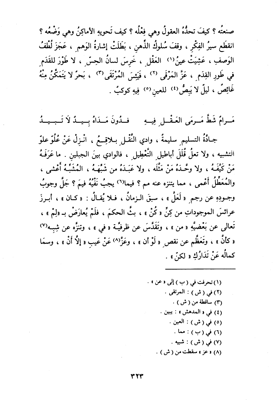 جادَّةُ التَّسليمِ سليمةٌ، وادي النٌقْلِ بلاقِعُ، انْزِلْ عَنْ عُلُوّ علوّ الشبيه، ولا تعل قُلَلَ أباطيلِ التَّعْطِيلِ، فالوادي بينَ الجبلينِ. ما عَرَفَهُ مَنْ كَيَّفَه، ولا وحَّدَهُ مَنْ مَثَّلَه، ولا عَبَدَهُ من شَبَّهَة، المشبِّه أعْشى، والمُعَطِّل أَعْمى، مما يتنزه عنه مم؟ فيما (¬6) يجبُ نَفْيُهُ فيمَ؟ جَلَّ وجوبُ وجودِهِ عن رجمِ " لَعَلَّ "، سبقَ الزمانُ، فلا يُقالُ: " كان "، أبرزَ عرائسَ الموجوداتِ من كِنِّ " كُنْ "، بثَّ الحكمَ، فلَمْ يعارَضْ بـ " لِمْ "، تَعالى عن بَعْضيَّهِ " من "، وتقدّسَ عن ظرفيَّة " في "، وتنزَّه عن شِبِه (¬7) " كأنَّ "، ويعَظُّم عن نقصِ " لَوْ أن "، وعَزَّ (¬8) عَنْ عَيبِ " إلَّا أَنْ "، وسمَا كمالُه عَنْ تَدَارُكِ " لكنّ ".
