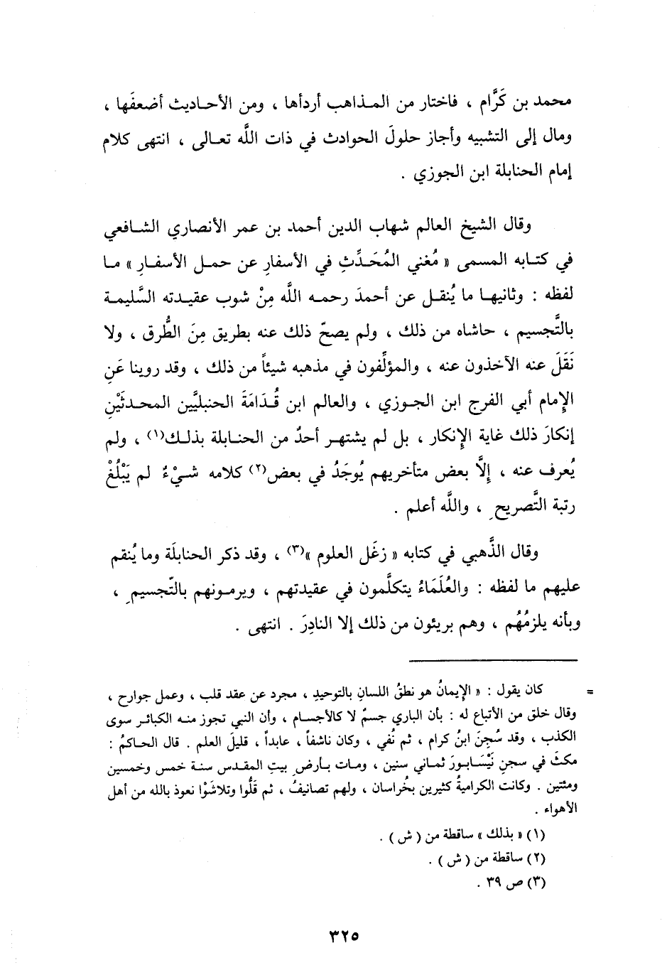 وقال الشيخ العالم شهاب الدين أحمد بن عمر الأنصاري الشافعي في كتابه المسمى " مُغني المُحَدِّثِ في الأسفار عن حمل الأسفارِ " ما لفظه: وثانيها ما يُنقل عن أحمدَ رحمه الله مِنْ شوب عقيدته السليمة بالتجسيم، حاشاه من ذلك، ولم يصحّ ذلك عنه بطريق منَ الطُّرق، ولا نَقَلَ عنه الآخذون عنه، والمؤلِّفون في مذهبه شيئاً من ذلك، وقد روينا عَنِ الإمام أبي الفرج ابن الجوزي، والعالم ابن قُدامَة الحنبليَّين المحدثَيْنِ إنكارَ ذلك غاية الإنكار، بل لم يشتهر أحدٌ من الحنابلة بذلك (¬1)، ولم يُعرف عنه، إلا بعض متأخريهم يُوجدُ في بعض (¬2) كلامه شيْءٌ لم يبْلُغْ رتبة التَّصريحِ، والله أعلم.