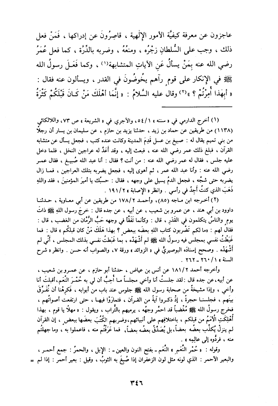 (¬2) أخرجه ابن ماجه (85)، وأحمد 2/ 178 من طريقين عن أبي معاوية، حدثنا داوود بن أبي هند، عن عمرو بن شعيب، عن أبيه، عن جده قال: خرجَ رسول اللهِ - صلى الله عليه وسلم - ذات يوم والناسُ يتكلمون في القَدَرِ، قال: وكأنما تَفَقَّأ في وجهه حَبُّ الرُّمَّان من الغضب، قال: فقال لهم: " ما لكم تَضْربون كتاب الله بعضَه ببعضٍ؟ بهذا هَلَك منْ كان قبلكُم " قال: فما غبَطْتُ نفسي بمجلس فيه رسولُ الله - صلى الله عليه وسلم - أشْهَدْه، بما غبَطتُ نفسي بذلك المجلس، أَنَّي لم أَشْهَدْه. وصحح إسنادَه البوصيريُّ في " الزوائد " ورقة 7، والصواب أنَّه حسن. وانظر " شرح السنة " 1/ 260 - 262.