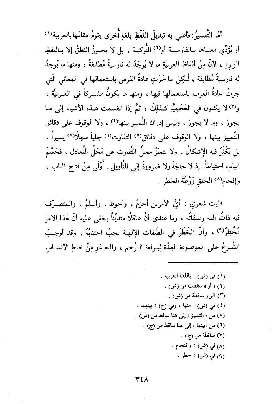 أمّا التَّفسيرُ: فأعني به تبديلَ اللّفْظِ بلغةٍ أُخرى يقوم مقامَها بالعربية (¬1) أو يُؤَدِّي معناها بالفارسية أو (¬2) التُّركية، بل لا يجوز النطقُ إلا باللفظِ الوارِدِ، لأن منْ ألفاظ العربيّةِ ما لا يوجَد له فارسيةٌ مُطابقةٌ، ومنها ما يُوجدُ له فارسيةٌ مُطابقة، لكنْ ما جَرَتِ عادةُ الفرس باستعمالها في المعاني الّتي جَرَتْ عادةُ العرب باستعمالها فيها، ومنها ما يكون مشتركاً في العربيَّة، و (¬3) لا يكون في العَجَمِيَّةِ كذلِكَ، ثمَّ إذا انقسمت هذه الأشياء إلى ما يجوز، وما لا يجوز، وليس إدراك التمييز بينها (¬4)، ولا الوقوف على دقائق التّمييز بينها، ولا الوقوف على دقائق (¬5) التفاوت (¬6) جلياً سهلاً (¬7) يسيراً، بل يَكْثُرُ فيه الإِشكالُ، ولا يتميزُ محل التَّفاوت عن مَحَلِّ التَّعادل، فَحَسْم الباب احتياطاً -إذ لا حاجَةَ ولا ضرورةَ إلى التَّأويل- أوْلى منْ فتح الباب، وإقحام (¬8) الخلقِ وَرْطَةَ الخطر.