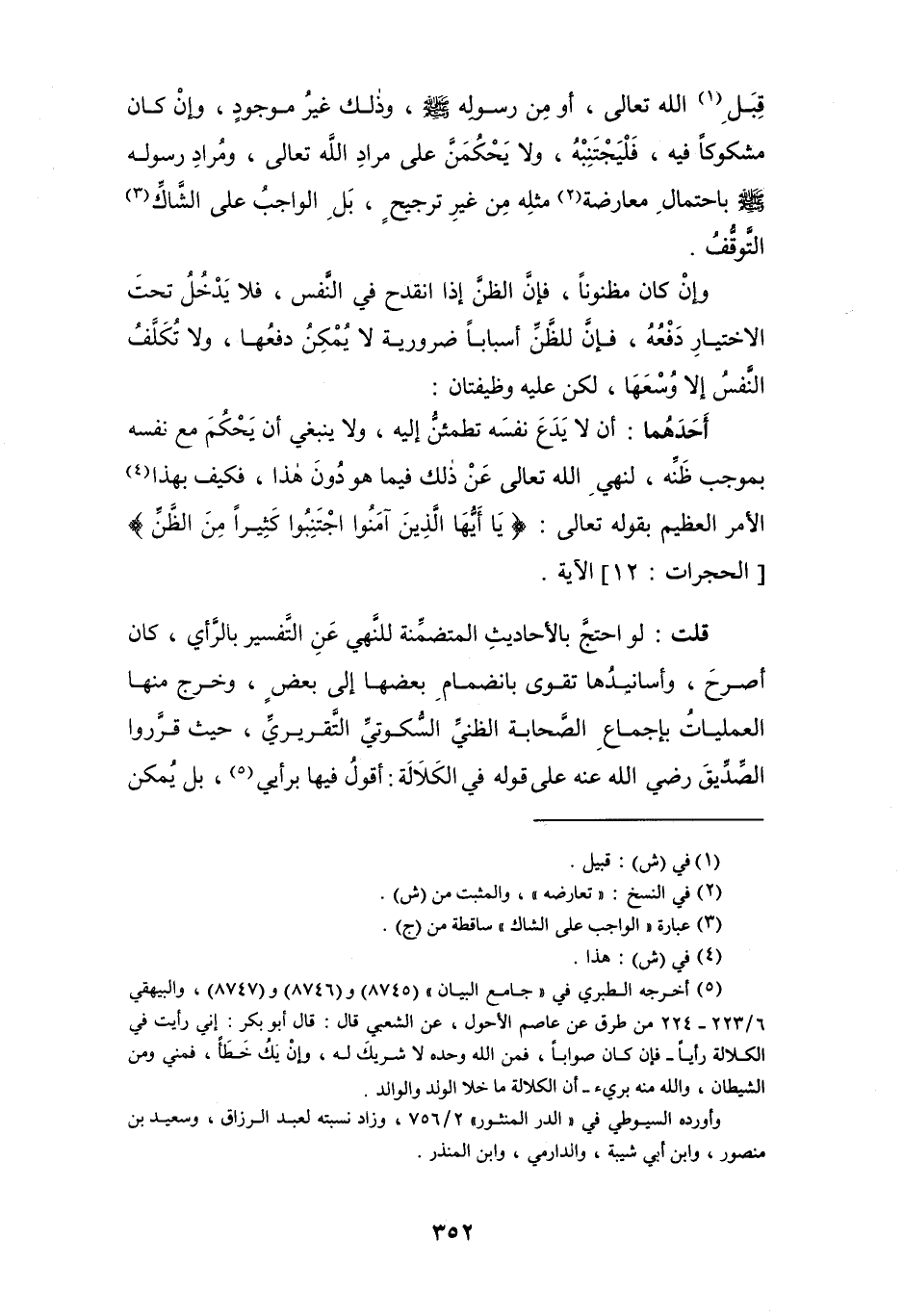 قلت: لو احتجَّ بالأحاديثِ المتضمِّنة للنَّهي عَنِ التَّفسير بالرَّأي، كان أصرح، وأسانيدُها تقوى بانضمامِ بعضها إلى بعضٍ، وخرج منها العملياتُ بإجماعِ الصَّحابة الظني السُّكوتيِّ التَّقريريِّ، حيث قرَّروا الصَّدِّيقَ رضي الله عنه على قوله في الكَلاَلَة: أقول فيها برأيي (¬5)، بل يمكن