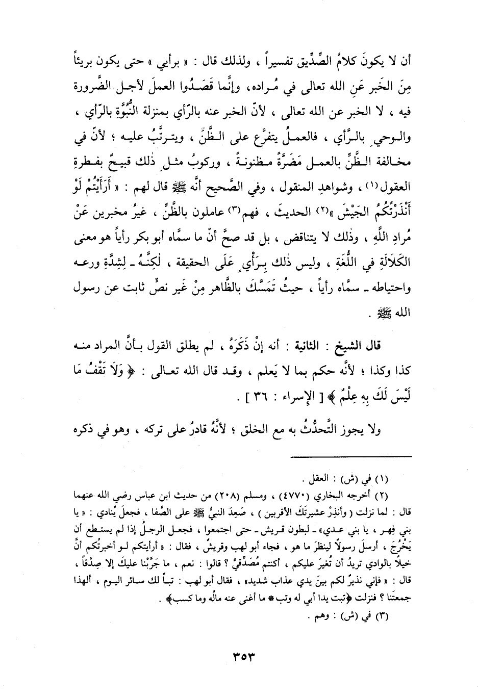 قال الشيخ: الثانية: أنَّه إنْ ذَكَرَه، لم يطلق القول بأنَّ المراد منه كذا وكذا، لأنَّه حكم بما لا يَعلم، وقد قال الله تعالى: {وَلَا تَقْفُ مَا لَيْسَ لَكَ بِهِ عِلْم} [الإسراء: 36].