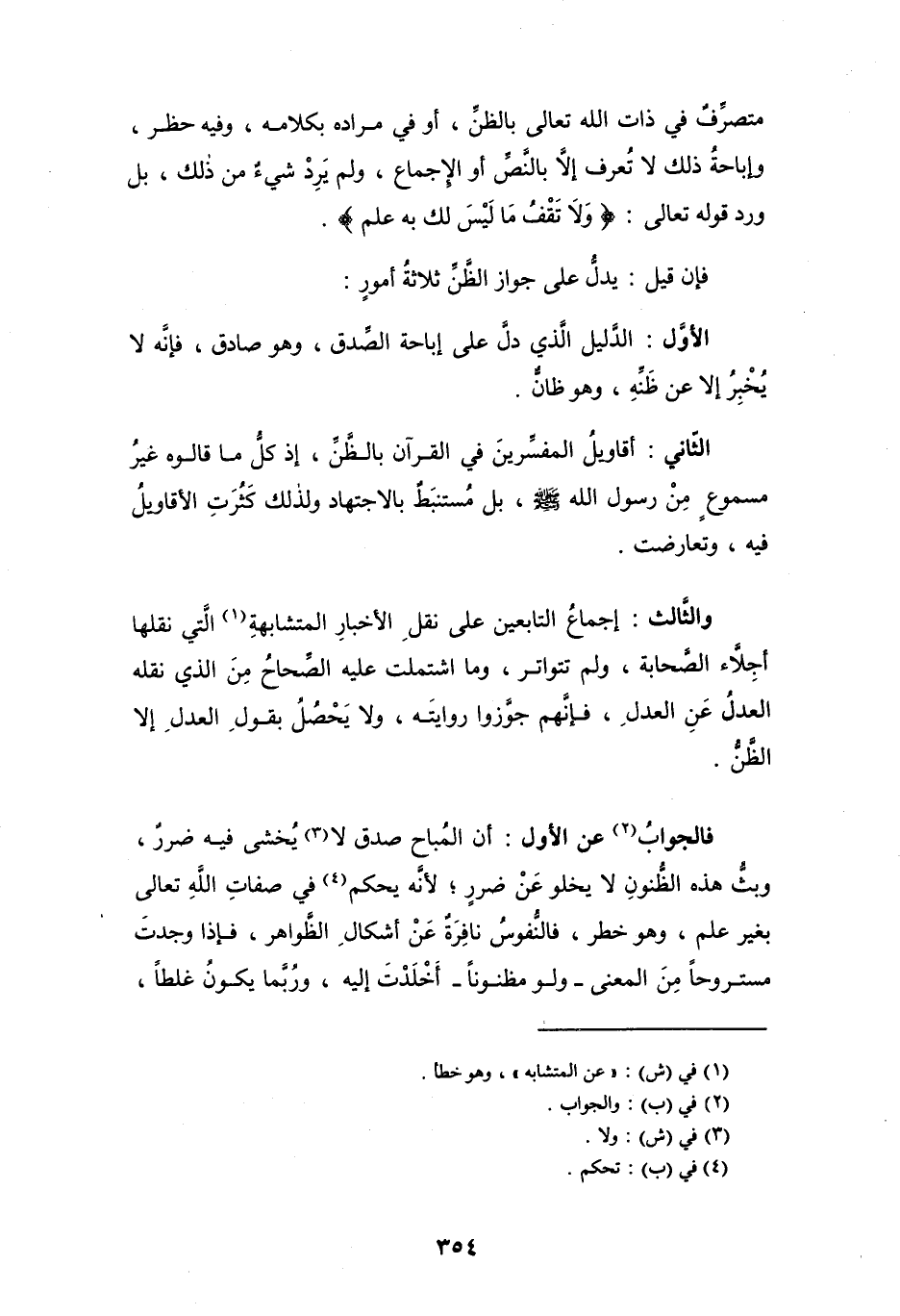فالجوابُ (¬2) عن الأول: أن المُباحٍ صدق لا (¬3) يُخشى فيه ضررٌ، وبث هذه الظُنونِ لا يخلو عَنْ ضررٍ، لأنَّه يحكم (¬4) في صفاتِ اللهِ تعالى بغير علم، وهو خطر، فالنُّفوس نافِرَةٌ عَنْ أشكال الظَّواهر، فإذا وجدتَ مستروحاً مِنَ المعنى -ولو مظنوناً- أخْلَدْت إليه، ورُبَّما يكونُ غلطاً،