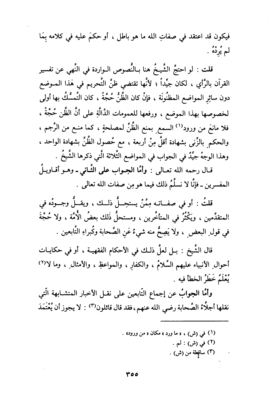 قال رحمه الله تعالى: وأما الجواب على الثاني -وهو أقاويلُ المفسرين- فإنَّا لا نسلِّمُ ذلك فيما هو مِن صفات الله تعالى.