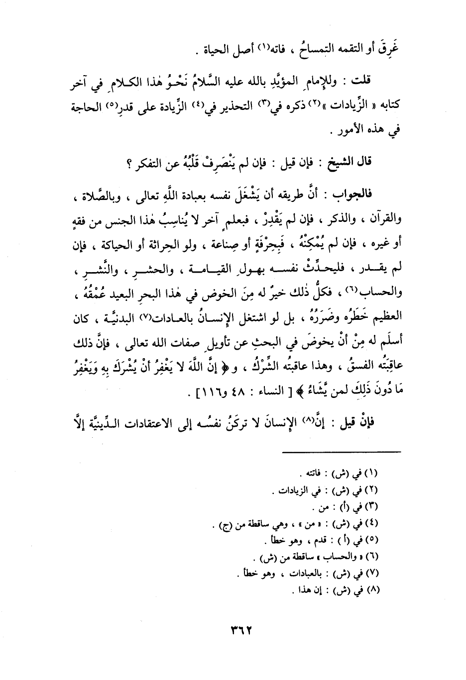 فالجواب: أنَّ طريقه أن يَشْغَلَ نفسه بعبادة اللهِ تعالى، وبالصَّلاة، والقرآن، والذكر، فإن لم يَقْدِرْ، فبعلمٍ آخر لا يُناتسِبُ هذا الجنس من فقهٍ أو غيره، فإن لم يُمْكنْه، فَبِحِرْفَةٍ أو صناعة، ولو الحِراثة أو الحياكة، فإن لم يقدر، فليحدِّثْ نفسه بهولِ القيامة، والحشرِ، والنَّشرِ، والحساب (¬6)، فكلُّ ذلك خيرٌ له مِنَ الخوض في هذا البحر البعيد عُمْقُهُ، العظيم خَطَره وضَرَرُهُ، بل لو اشتغل الإنسانُ بالعادات (¬7) البدنية، كان أسلم له مِنْ أنْ يخوضَ في البحث عن تأويلِ صفات الله تعالى، فإنَّ ذلك عاقِبَتُه الفسقُ، وهذا عاقبتُه الشِّرْكُ، و {إِنَّ اللَّهَ لَا يَغْفِرُ أَنْ يُشْرَكَ بِهِ وَيَغْفِرُ مَا دُونَ ذَلِكَ لِمَنْ يَشَاءُ} [النساء: 48 و116].