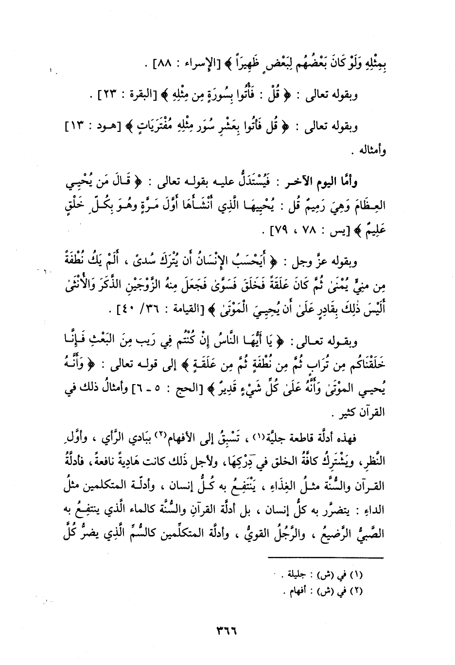وبقوله تعالى: {يَا أَيُّهَا النَّاسُ إِنْ كُنْتُمْ فِي رَيْبٍ مِنَ الْبَعْثِ فَإِنَّا خَلَقْنَاكُمْ مِنْ تُرَابٍ ثُمَّ مِنْ نُطْفَةٍ ثُمَّ مِنْ عَلَقَةٍ} إلى قوله تعالى: {وَأَنَّهُ يُحْيِ الْمَوْتَى وَأَنَّهُ عَلَى كُلِّ شَيْءٍ قَدِيرٌ} [الحج: 5 - 6] وأمثالُ ذلك في القرآن كثير.