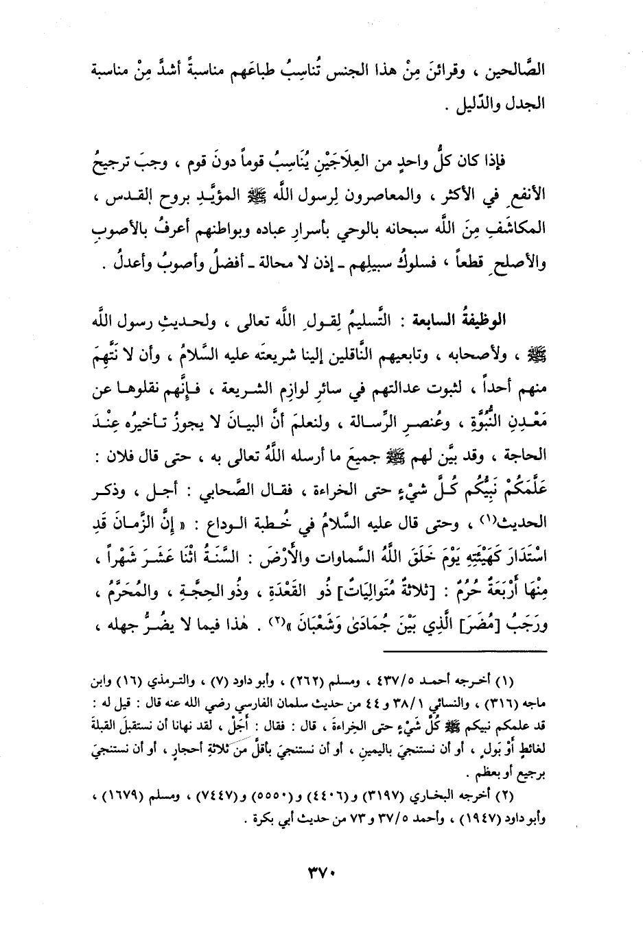 الوظيفةُ السابعة: التسليمُ لِقولِ الله تعالى، ولحديثِ رسول الله - صلى الله عليه وسلم -، ولأصحابه، وتابعيهم النَّاقلين إلينا شريعتَه عليه السَّلام، وأن لا نَتَّهِمَ منهم أحداً، لثبوت عدالتهم في سائرِ لوازِم الشريعة، فإنَّهم نقلوها عن معْدِنِ النبوة، وعُنصرِ الرِّسالة، ولنعلمَ أنَّ البيانَ لا يجوزُ تأخيره عِنْدَ الحاجة، وقد بيَّن لهم - صلى الله عليه وسلم - جميعَ ما أرسله الله تعالى به، حتى قال فلان: عَلَّمَكُمْ نَبِيُّكُم كُلَّ شيْءٍ حتى الخراءة، فقال الصَّحابي: أجل، وذكر الحديث (¬1)، وحتى قال عليه السلامُ في خُطبة الوداع: " إِنَّ الزّمانَ قَدِ اسْتَدَارَ كَهَيْئَتِهِ يَوْمَ خَلَقَ الله السماوات والأرْضَ: السَّنَةُ اثْنَا عَشَرَ شَهْراً، مِنْهَا أرْبَعَةٌ حُرُمٌ: [ثلاثةٌ مُتَوالِياتٌ] ذُو القَعْدَةِ، وذُو الحِجَّةِ، والمُحَرَّم، ورَجَبُ [مُضَرَ] الَّذِي بَيْنَ جُمَادَى وَشَعْبَانَ " (¬2). هذا فيما لا يضُرُّ جهله،
