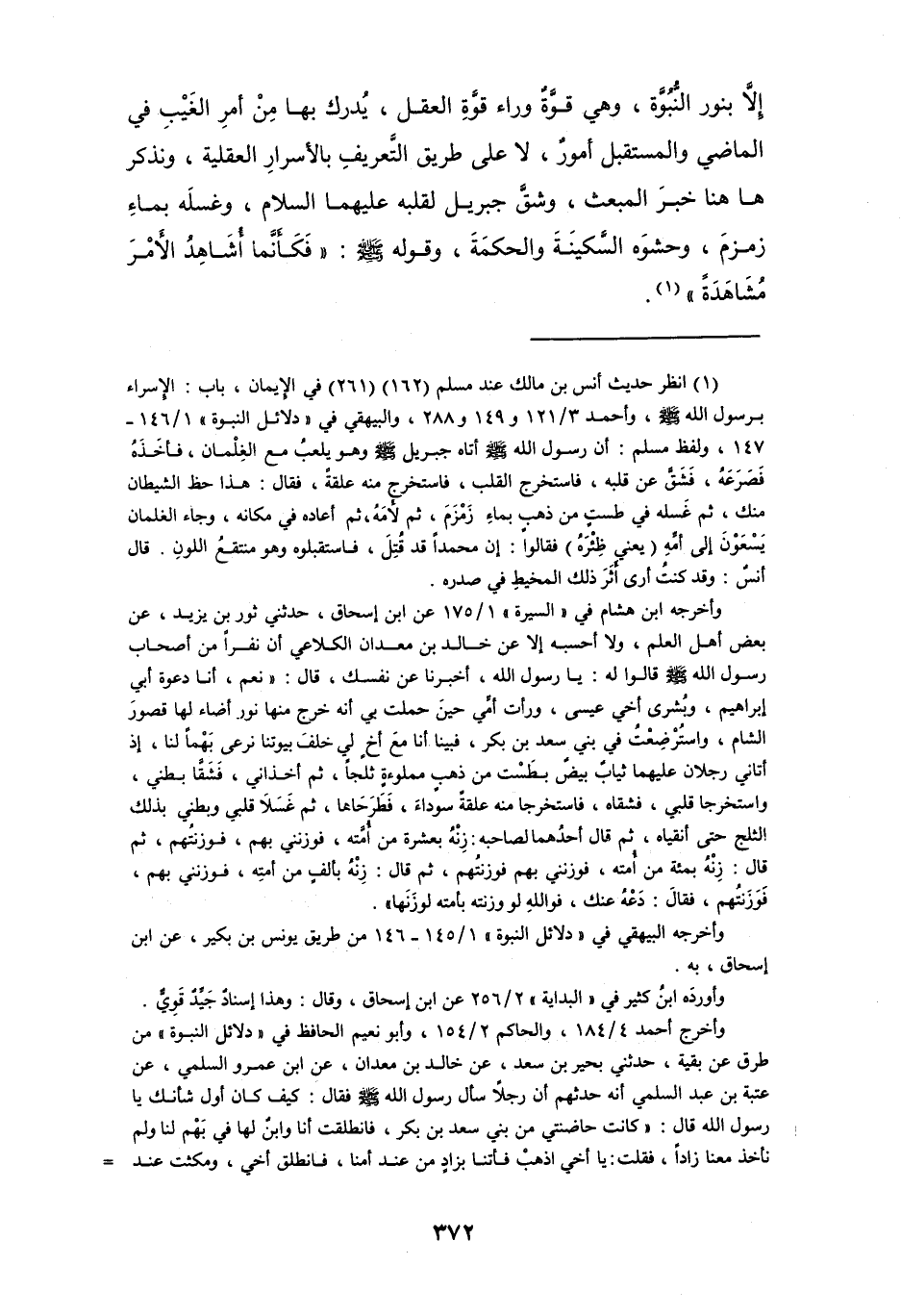 (¬1) انظر حديث أنس بن مالك عند مسلم (162) (261) في الإيمان، باب: الإسراء برسول الله - صلى الله عليه وسلم -، وأحمد 3/ 121 و149 و288، والبيهقي في " دلائل النبوة " 1/ 146 - 147، ولفظ مسلم: أن رسول الله - صلى الله عليه وسلم - أتاه جبريل - صلى الله عليه وسلم - وهو يلعبُ مع الغلْمان، فأخذَهُ فَصَرَعَهُ، فَشَقَّ عن قلبه، فاستخرج القلب، فاستخرج منه علقةً، فقال: هذا حظ الشيطان منك، ثم غَسله في طستٍ من ذهب بماءِ زَمْزَمَ، ثم لأمهُ، ثم أعاده في مكانه، وجاء الغلمان يَسْعَوْنَ إلى أمِّهِ (يعني ظِئْرَه) فقالوا: إن محمداً قد قُتِلَ، فاستقبلوه وهو منتقعُ اللونِ. قال أنسٌ: وقد كنتُ أرى أثَرَ ذلك المخيطِ في صدره.