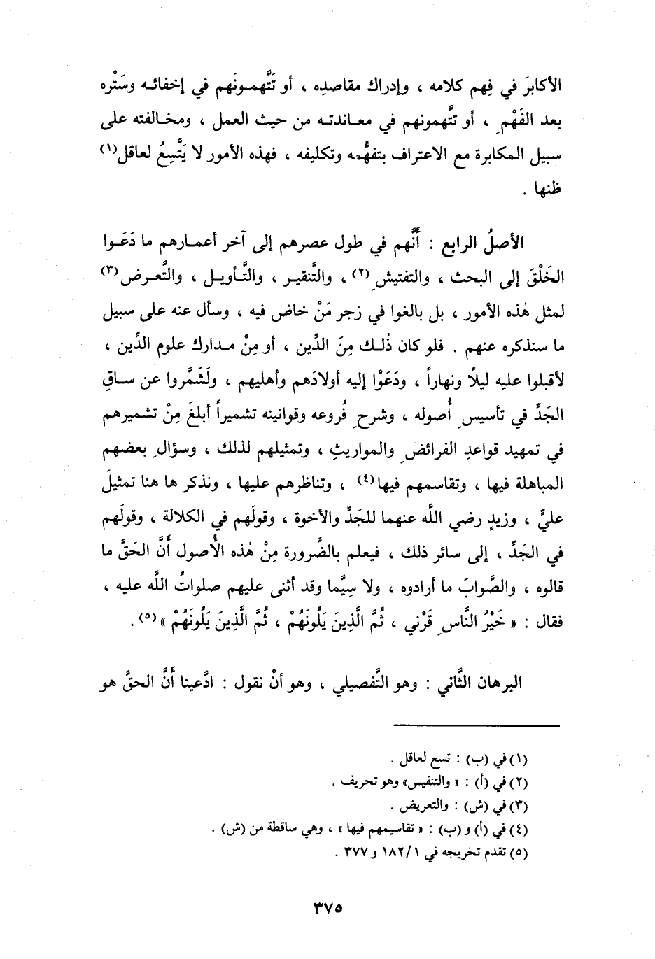 الأصلُ الرابع: أنَّهم في طول عصرهم إلى آخر أعمارهم ما دَعَوا الخَلْقَ إلى البحث، والتفتيشِ (¬2)، والتَّنقير، والتَّأويل، والتَّعرض (¬3) لمثل هذه الأمور، بل بالغوا في زجر مَنْ خاض فيه، وسأل عنه على سبيل ما سنذكره عنهم. فلو كان ذلك مِنَ الدِّين، أو مِنْ مدارك علوم الدِّين، لأقبلوا عليه ليلاً ونهاراً، ودعَوْا إليه أولادَهم وأهليهم، ولَشَمَّروا عن ساقِ الجَدِّ في تأسيسِ أُصوله، وشرحِ فُروعه وقوانينه تشميراً أبلغَ مِنْ تشميرهم في تمهيد قواعدِ الفرائضِ والمواريثِ، وتمثيلهم لذلك، وسؤالِ بعضهم المباهلة فيها، وتقاسمهم فيها (¬4)، ويَناظرهم عليها، ونذكر ها هنا تمثيلَ عليٍّ، وزيدٍ رضي الله عنهما للجَدِّ والأخوة، وقولَهم في الكلالة، وقولَهم في الجَدِّ، إلى سائر ذلك، فيعلم بالضرورة مِنْ هذه الأُصول أنَّ الحَقَّ ما قالوه، والصوابَ ما أرادوه، ولا سِيَّما وقد أثنى عليهم صلوات الله عليه، فقال: " خَيْرُ الناسِ قرْني، ثمَّ الذين يَلونَهُمْ، ثُمَّ الذين يَلُونَهُمْ " (¬5).