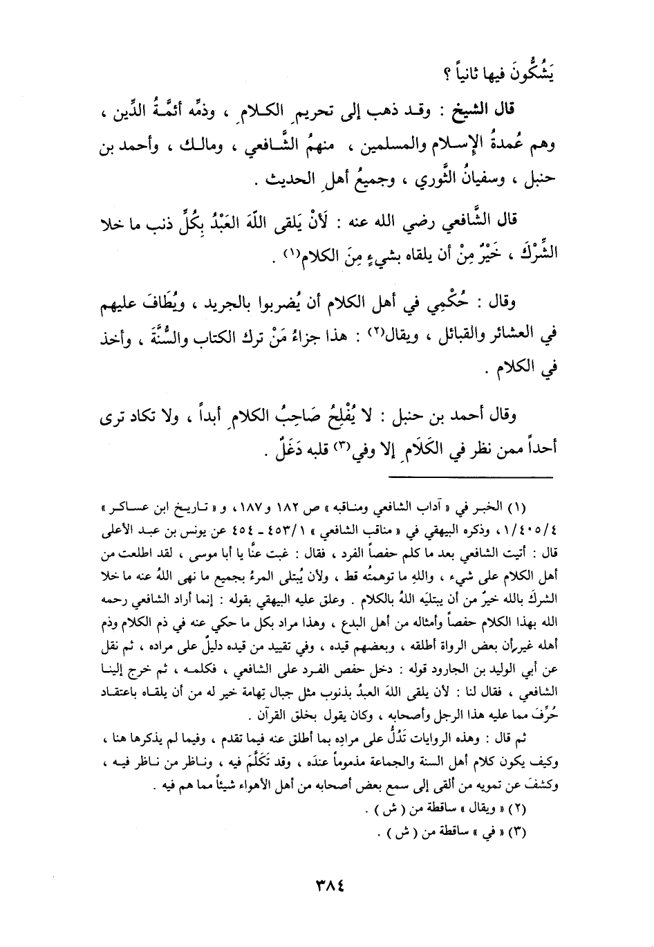 قال الشيخ: وقد ذهب إلى تحريم الكلام، وذمه أئمة الدين، وهم عمدة الإسلام والمسلمين، منهم الشافعي، ومالك، وأحمد بن حنبل، وسفيان الثوري، وجميع أهل الحديث.
