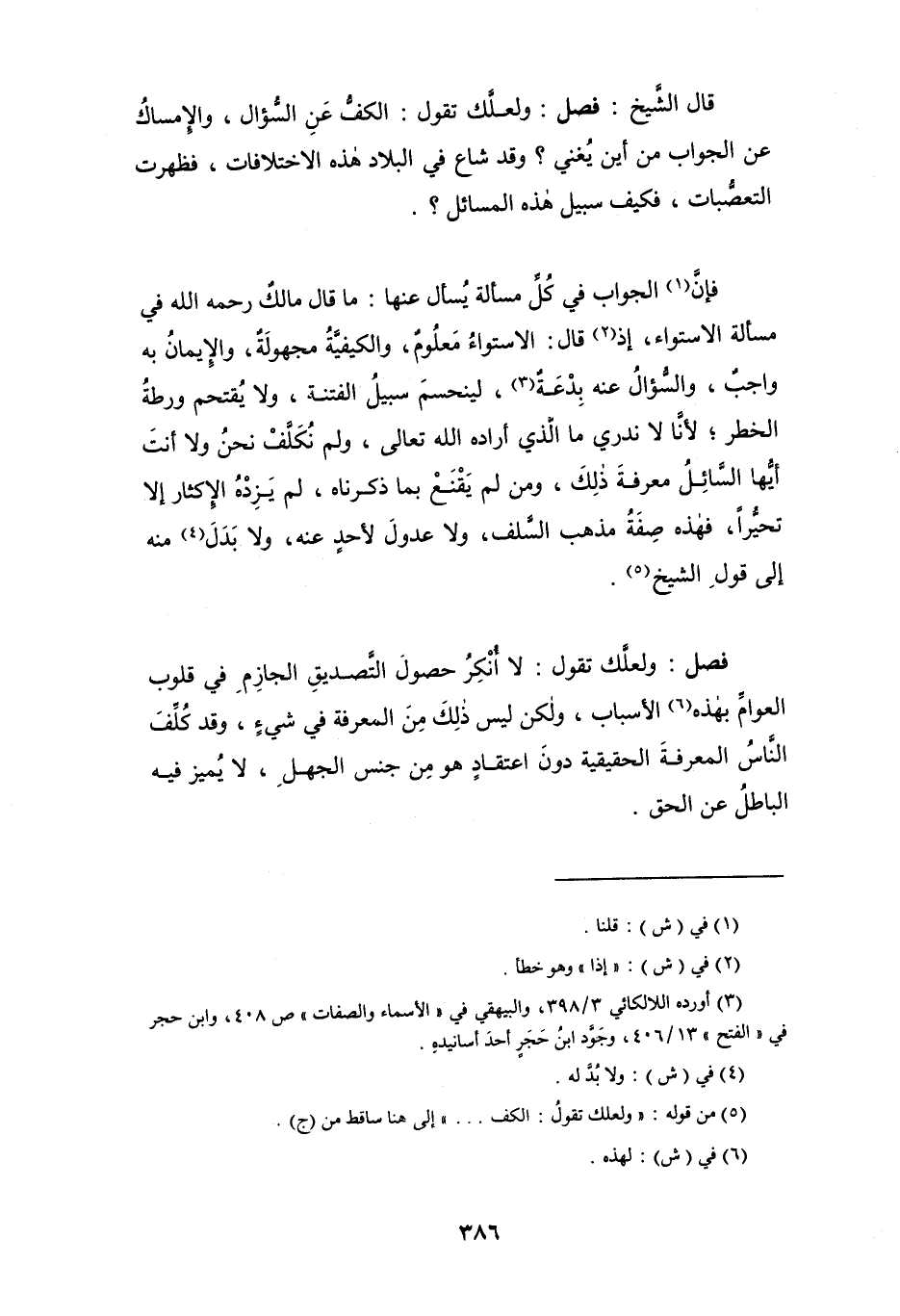 فإن (¬1) الجواب في كل مسألة يسأل عنها: ما قال مالك رحمه الله في مسألة الاستواء، إذ (¬2) قال: الاستواءُ معلوم، والكيفية مجهولة، والإيمان به واجب، والسؤال عنه بدعة (¬3)، لينحسم سبيل الفتنة، ولا يقتحم ورطة الخطر، لأنا لا ندري ما الذي أراده الله تعالى، ولم نكلف نحن ولا أنت أيها السائل معرفة ذلك، ومن لم يقنع بما ذكرناه، لم يزده الإكثار إلا تحيُّراً، فهذه صفة مذهب السلف، ولا عدول لأحدٍ عنه، ولا بدل (¬4) منه إلى قول الشيخ (¬5).