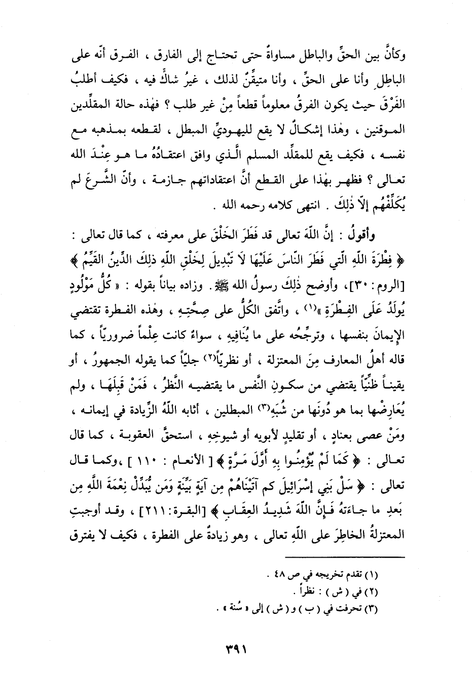 وأقول: إن الله تعالى قد فطر الخلق على معرفته، كما قال تعالى: {فِطْرَةَ اللَّهِ الَّتِي فَطَرَ النَّاسَ عَلَيْهَا لَا تَبْدِيلَ لِخَلْقِ اللَّهِ ذَلِكَ الدِّينُ الْقَيِّمُ} [الروم: 30]، وأوضح ذلك رسول الله - صلى الله عليه وسلم -. وزاده بياناً بقوله: " كل مولود يولد على الفطرة " (¬1)، واتفق الكل على صحته، وهذه الفطرة تقتضي الإيمان بنفسها، وترجحه على ما ينافيه، سواءٌ كانت علماً ضرورياً، كما قاله أهل المعارف من المعتزلة، أو نظرياً (¬2) جلياً كما يقوله الجمهور، أو يقيناً ظنياً يقتضي من سكون النفس ما يقتضيه النظر، فمن قبلها، ولم يعارضها بما هو دونها من شُبَهِ (¬3) المبطلين، أثابه الله الزيادة في إيمانه، ومن عصى بعنادٍ، أو تقليدٍ لأبويه أو شيوخه، استحق العقوبة، كما قال تعالى: {كَمَا لَمْ يُؤْمِنُوا بِهِ أَوَّلَ مَرَّة} [الأنعام: 110]، وكما قال تعالى: {سَلْ بَنِي إِسْرَائِيلَ كَمْ آَتَيْنَاهُمْ مِنْ آَيَةٍ بَيِّنَةٍ وَمَنْ يُبَدِّلْ نِعْمَةَ اللَّهِ مِنْ بَعْدِ مَا جَاءَتْهُ فَإِنَّ اللَّهَ شَدِيدُ الْعِقَاب} [البقرة: 211]، وقد أوجبت المعتزلة الخاطر على الله تعالى، وهو زيادة على الفطرة، فكيف لا يفترق