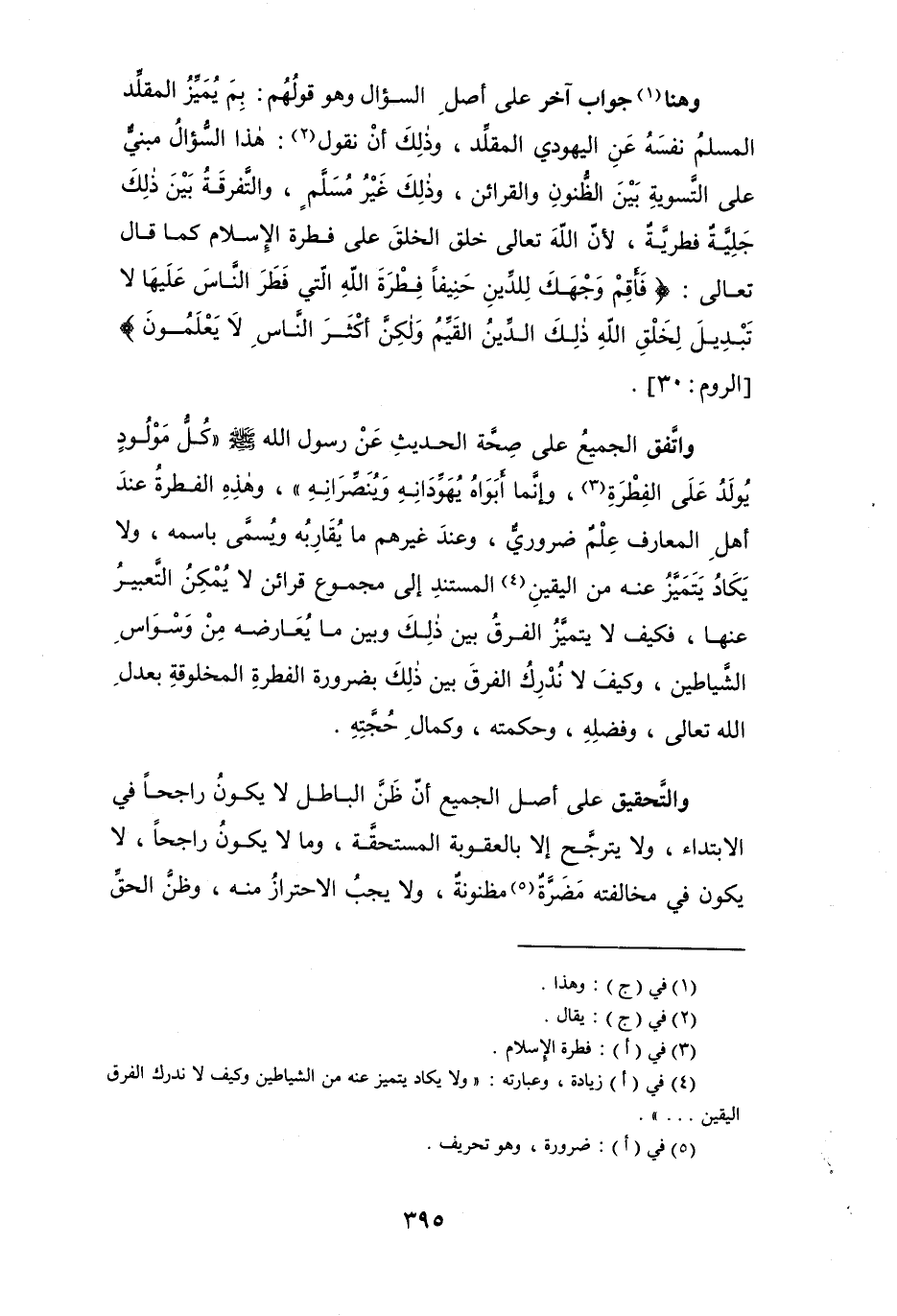 وهنا (¬1) جواب آخر على أصل السؤال وهو قولهم: بم يُميِّزُ المقلِّد المسلم نفسه عن اليهودي المقلِّد، وذلك أن نقول (¬2): هذا السُّؤال مبنيٌّ على التسوية بين الظنون والقرائن، وذلك غير مسلم، والتفرقة بين ذلك جلية فطرية، لأن الله تعالى خلق الخلق على فطرة الإسلام كما قال تعالى: {فَأَقِمْ وَجْهَكَ لِلدِّينِ حَنِيفًا فِطْرَةَ اللَّهِ الَّتِي فَطَرَ النَّاسَ عَلَيْهَا لَا تَبْدِيلَ لِخَلْقِ اللَّهِ ذَلِكَ الدِّينُ الْقَيِّمُ وَلَكِنَّ أَكْثَرَ النَّاسِ لَا يَعْلَمُونَ} [الروم: 30].