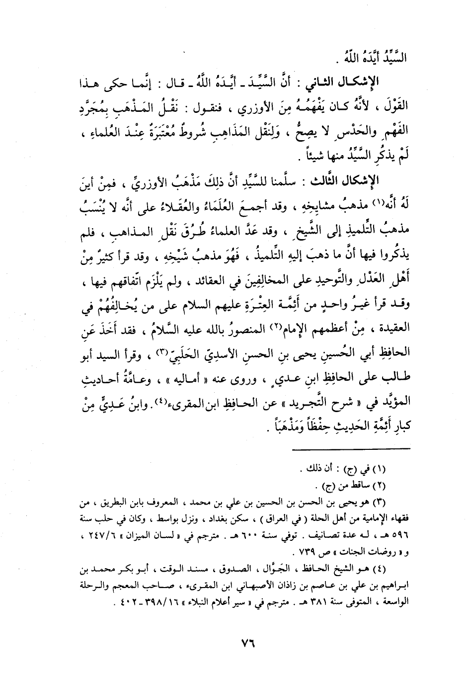 الإشكال الثالث: سلَّمنا للسيدِ أنَّ ذلكَ مَذْهَبُ الأوزريِّ، فمِنْ أين لَهُ أنه (¬1) مذهبُ مشايِخِهِ، وقد أجمعَ العُلَمَاءُ والعُقَلاءُ على أنَّه لا يُنْسَبُ مذهبُ التِّلميذِ إلى الشَّيخِ، وقد عَدَّ العلماءُ طُرُق نَقْلِ المذاهبِ، فلم يذكروا فيها أن ما ذهبَ إليه التَلميذُ، فَهُوَ مذهبُ شَيْخِهِ، وقد قرأ كثيرٌ مِنْ أَهْلِ العَدْلِ والتَّوحيدِ على المخالِفِينَ في العقائد، ولم يَلْزَم اتّفاقهم فيها، وقد قرأ غيرُ واحدٍ من أَئِمَّة العِتْرَةِ عليهم السلام على من يُخالِفُهمْ في العقيدة، منْ أعظمهم الإِمام (¬2) المنصورُ بالله علمِه السّلامُ، فقد أَخَذَ عَنِ الحافِظِ أبي الحُسينِ يحيى بنِ الحسنِ الأسدِيَ الحَلَبِي (¬3)، وقرأ السَّيِّد أبو طالب على الحافِظِ ابنِ عديٍ، وروى عنه " أماليه "، وعامَّةُ أحاديثِ المؤيَّد في " شرح التَّجريد " عن الحافِظ ابن المقرىء (¬4). وابنُ عَدِيٍّ مِنْ كبار أَئِمَّةِ الحَدِيثِ حِفْظَاً وَمَذْهَبَاً.