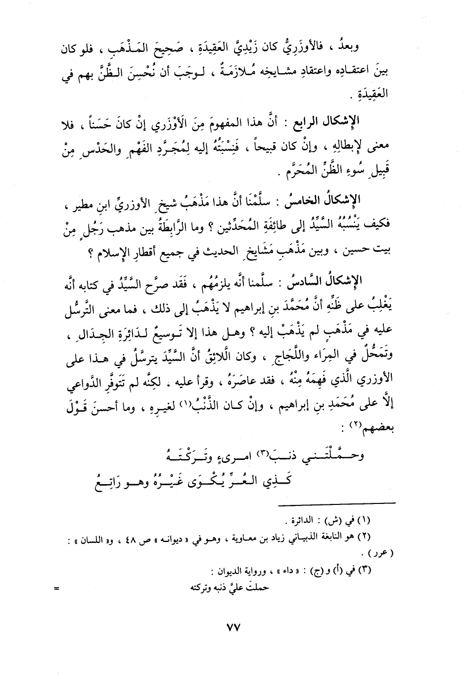 الإشكال السَّادسُ: سلَّمنا أنه يلزمُهُم، فَقَد صرَّح السَّيِّدُ في كتابه أنَّه يغْلِبُ على ظَنِّهِ أنَّ مُحمَّدَ بنِ إبراهيم لا يَذْهَبُ إلى ذلك، فما معنى التَرسُّل عليه في مذْهَبٍ لم يَذْهَبْ إليه؟ وهل هذا إلا تَوسيعٌ لدَائِرَةِ الجِدَالِ، وتَمَحُّل في المِرَاء واللَّجَاجِ، وكان اللائِقُ أنَّ السيدَ يترسلُ في هذا على الأوزري الذي فَهِمَهُ مِنْه، فقد عاصَرهُ، وقرأ عليه. لكِنَّه لم تتَوفَّرِ الدَّواعي إلا على مُحمدِ بنِ إبراهيم، وإنْ كان الذَّنْبُ (¬1) لغيرِه، وما أحسنَ قَوْلَ بعضهم (¬2):