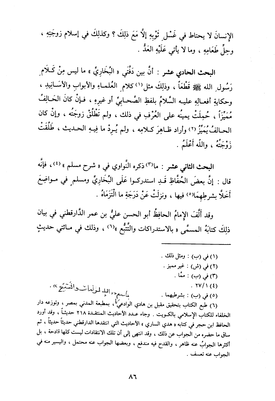 (¬6) طبع الكتاب بتحقيق مقبل بن هادي الوادعي، بمطبعة المدني بمصر، وتوزعه دار الخلفاء للكتاب الإسلامي بالكويت. وجاء عدد الأحاديث المنتقدة 218 حديثاً، وقد أورد الحافظ ابن حجر في كتابه " هدي الساري " الأحاديث التي انتقدها الدارقطني حديثاًً حديثاًً، ثم ساق ما حضره من الجواب عن ذلك، وقد انتهى إلى أن تلك الانتقادات ليست كلها قادحة، بل أكثرها الجوابُ عنه ظاهر، والقدح فيه مندفع، وبعضها الجواب عنه محتمل، واليسير منه في الجواب عنه تعسف.