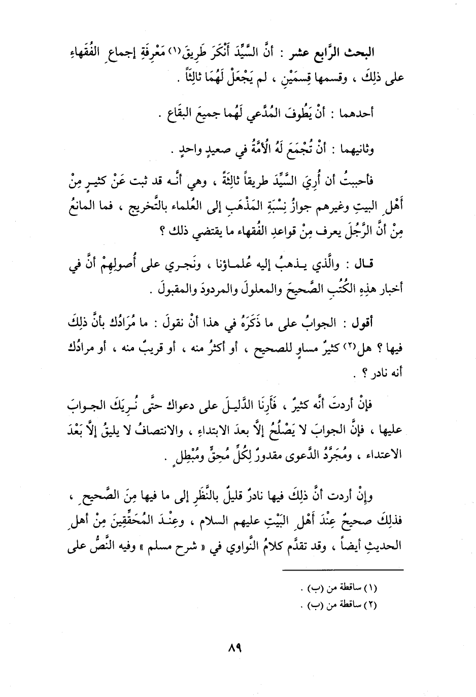 البحث الرابع عشر: أنَّ السيدَ أَنْكرَ طَرِيقَ (¬1)، مَعْرِفَة إجماع الفقَهاءِ على ذلِكَ، وقسمها قسميْنِ، لم يَجْعَلْ لهُمَا ثالِثاً.