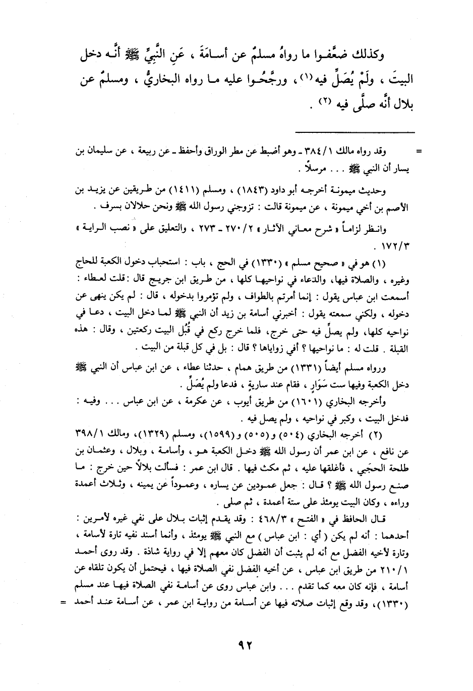 وكذلك ضعَّفوا ما رواهُ مسلمٌ عن أسامَةَ، عَنِ النَّبِيِّ - صلى الله عليه وسلم - أنَّه دخل البيتَ، ولَمْ يُصَلِّ فيه (¬1)، ورجَّحُوا عليه ما رواه البخاريُّ، ومسلمٌ عن بلال أنَّه صلَّى فيه (¬2).