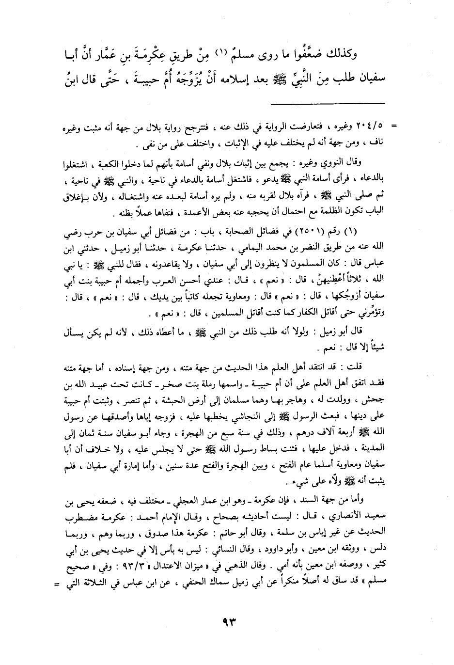 وكذلك ضعَّفُوا ما روى مسلمٌ (¬1) منْ طريقِ عِكْرِمَةَ بنِ عَمَّار أنَّ أبا سفيان طلب مِنَ النَّبِيِّ - صلى الله عليه وسلم - بعد إسلامه أَنْ يُزَوِّجَهُ أُمَّ حبيبةَ، حَتَّى قال ابنُ