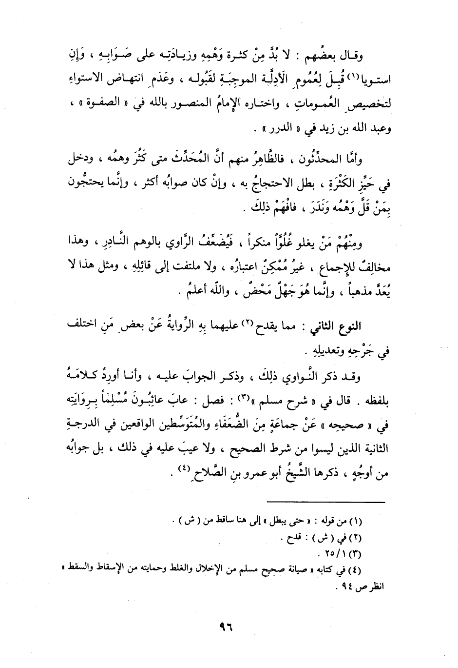ومِنْهُمْ مَنْ يغلو غُلُوَّاً منكراً، فيُضَعِّفُ الرَّاوي بالوهم النَّادِرِ، وهذا مخالِفٌ للإجماع، غيرُ مُمْكِنٌ اعتبارُه، ولا ملتفت إلى قائِلهِ، ومثل هذا لا يُعَدَّ مذهباً، وإنَّما هُوَ جَهْلٌ مَحْضٌ، والله أعلمُ.
