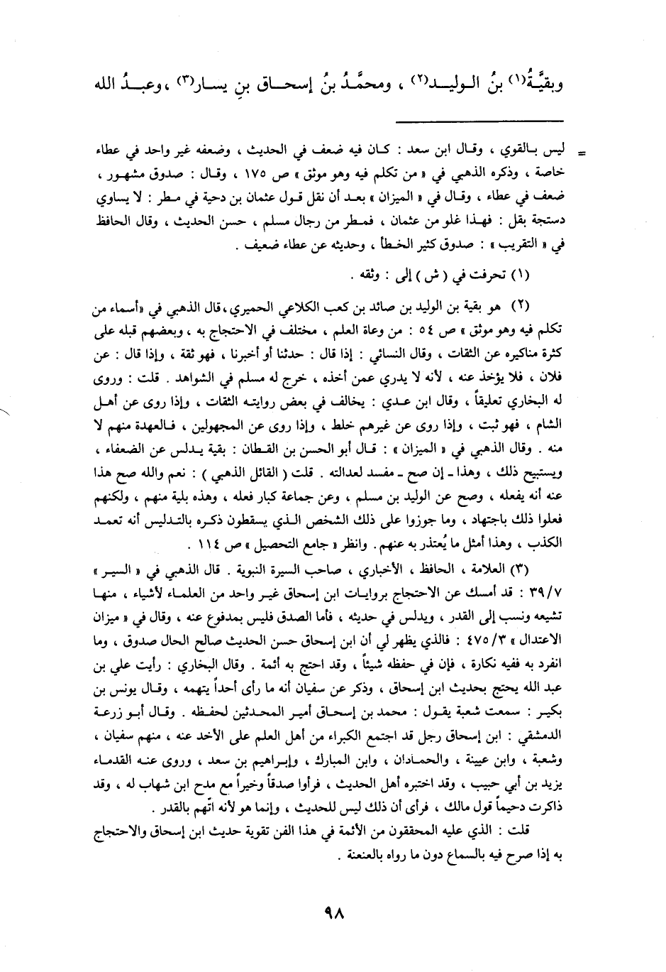قلت: الذي عليه المحققون من الأئمة في هذا الفن تقوية حديث ابن إسحاق والاحتجاج به إذا صرح فيه بالسماع دون ما رواه بالعنعنة.
