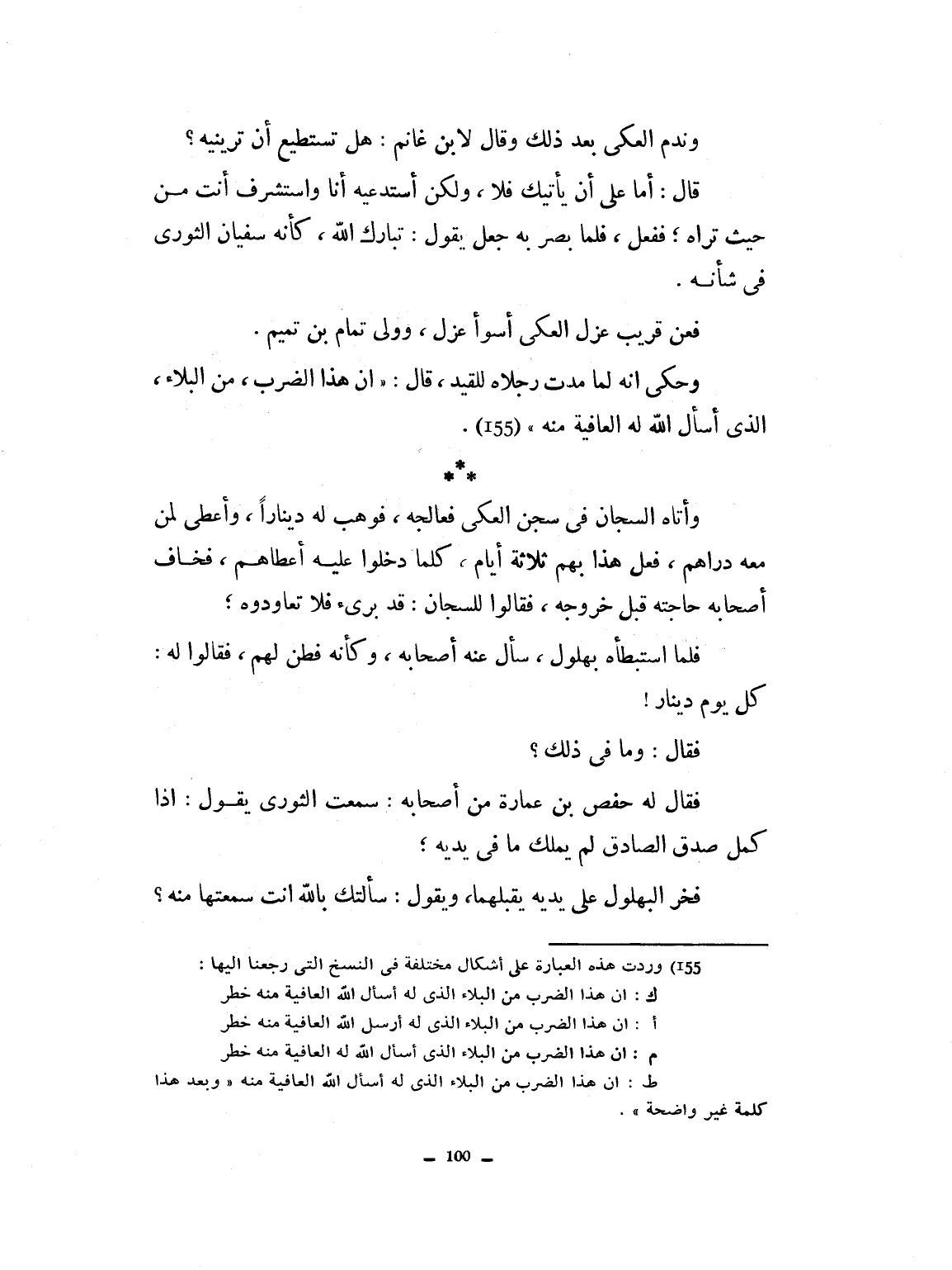 فلما بصر به جعل يقول تبارك الله كأنه سفيان الثوري في شأنه، فعن قريب عزل العكي اسوأ عزل وولي تمام بن تميم. وحكي أنه لما مدت رجلاه للقيد قال إن هذا الضرب من البلاء الذي لم أسأل الله العافية منه خطرة. وأتاه السجان في سجن العكي فعالجه فوهب إليه ديناراً وأعطى لمن معه دراهم، فعل بهم هذا ثلاثة أيام. كلما دخلوا عليه إعطاهم. فخاف أصحابه حاجته قبل خروجه فقالوا للسجان قد برىء فلا تعاودوه. فلما استبطأه بهلول سأل عنه أصحابه، وكأنه فطن لهم، فقالوا له لكل يوم دينار؟ فقال وما في ذلك؟ فقال له حفص بن عمارة من أصحابه سمعت الثوري يقول: إذا كمل صدق الصادق لم يملك ما في يديه. فخر بهلول على يديه يقبلهما ويقول سألتك بالله أنت سمعتها منه؟
