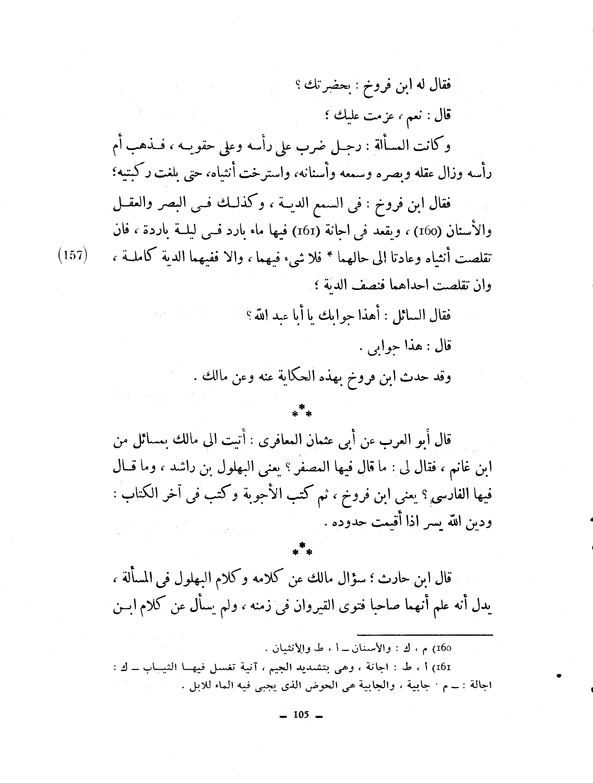 فقال له ابن فروخ: بحضرتك. قال نعم. عزمت عليك. وكانت المسألة: رجل ضرب على رأسه وعلى حقويه فذهب أم رأسه، وزال عقله وبصره وسمعه وأسنانه واسترخت انثياه، حتى بلغت ركبتيه. فقال له ابن فروخ: في السمع الدية، وكذلك في البصر والعقل والأسنان، ويقعد في إجالة فيها ماء بارد في ليلة باردة. فإن تقلصت انثياه وعادتا لحالهما فلا شيء عليه، وإلا ففيها الدية كاملة. وإن تقلصت إحداهما فنصف الدية. فقال السائل لمالك أهذا جوابك يا أبا عبد الله. قال هذا جوابي. وقد حدث ابن فروخ بهذه الحكاية عنه وعن مالك. قال أبو العرب، عن أبي عثمان المعافري: أتيت إلى مالك بمسائل من ابن غانم، فقال لي ما قال فيها المصفر يعني البهلول بن راشد. وما قال فيها الفارسي، يعني ابن فروخ. ثم كتب الأجوبة وكتب في آخر الكتاب ودين الله يسر إذا أقيمت حدوده. فقال ابن حارث وسؤال مالك عن كلامه، وكلام البهلول في المسالة يدل على أنه علم أنهما صاحبا فتوى القيروان في زمنه. ولم يسأل عن كلام ابن