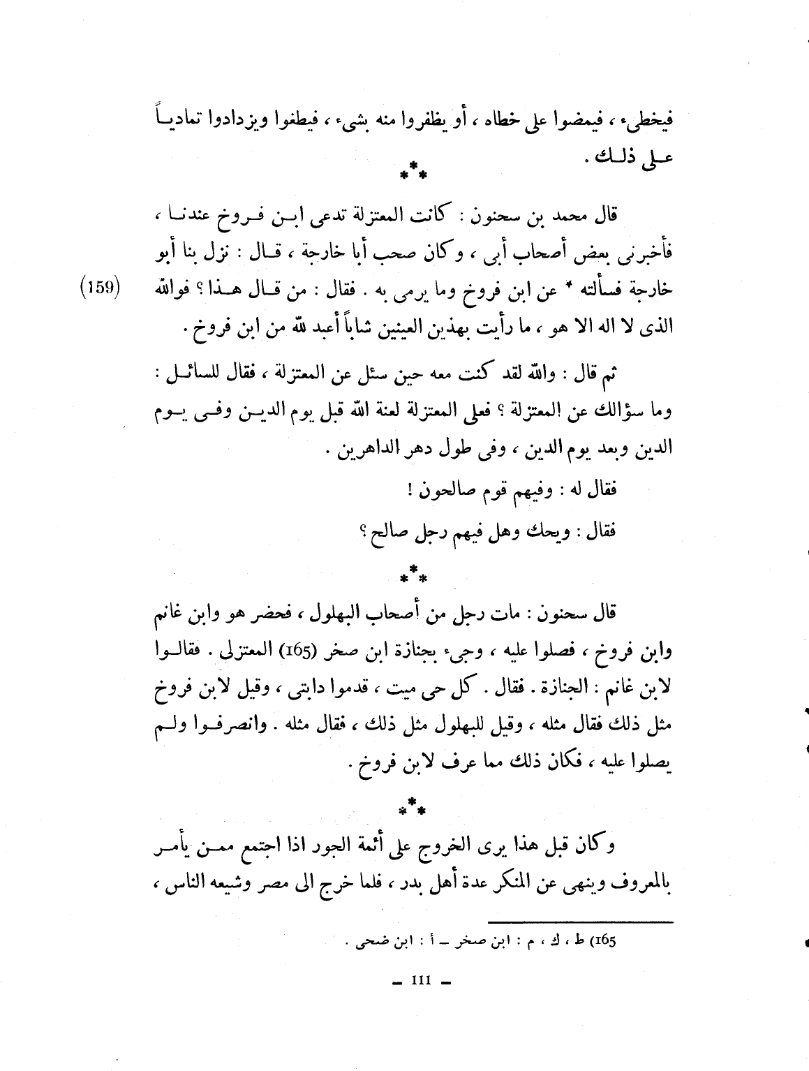فتخطىء، فيمضون على خطاك أو يظفروا منه بشيء، فيطغوا ويزدادوا تمادياً على ذلك. قال محمد بن سحنون كانت المعتزلة تدعي ابن فروخ عندنا. فأخبرني بعض أصحاب أبي وكان صحب أبا خارجة. قال: نزل بنا أبو خارجة فسألته عن ابن فروخ وما يرمي به. فقال من قال هذا، فو الله الذي لا إله إلا هو، ما رأيت بهذين العينين شاباً أعبد لله من ابن فروخ. ثم قال: فو الله لقد كنت معه حتى سئل عن المعتزلة، فقال للسائل: وما سؤالك عن المعتزلة؟ فعلى المعتزلة لعنة الله قبل يوم الدين، وفي يوم الدين، وبعد يوم الدين، وفي طول دهر الداهرين. فقال له: وما فيهم قوم صالحون. فقال ويحك، وهل فيهم رجل صالح؟ قال سحنون: مات رجل من أصحاب البهلول، فحضر هو وابن غانم وابن فروخ فصلوا عليه وجيء بجنازة ابن صخرة المعتزلي، فقالوا لابن غانم الجنازة. فقال كل حي ميت. قدموا دابتي. وقيل لابن فروخ مثل ذلك. فقال مثله. وقيل للبهلول مثل ذلك، فقال مثله. وانصرفوا ولم يصلوا عليه. فكان ذلك مما عرف لابن فروخ. وكان قبل هذا يرى الخروج على أئمة الجور، إذا اجتمع ممن يأمر بالمعروف وينهى عن المنكر عدة أهل بدر. فلما خرج إلى مصر وشيعه الناس