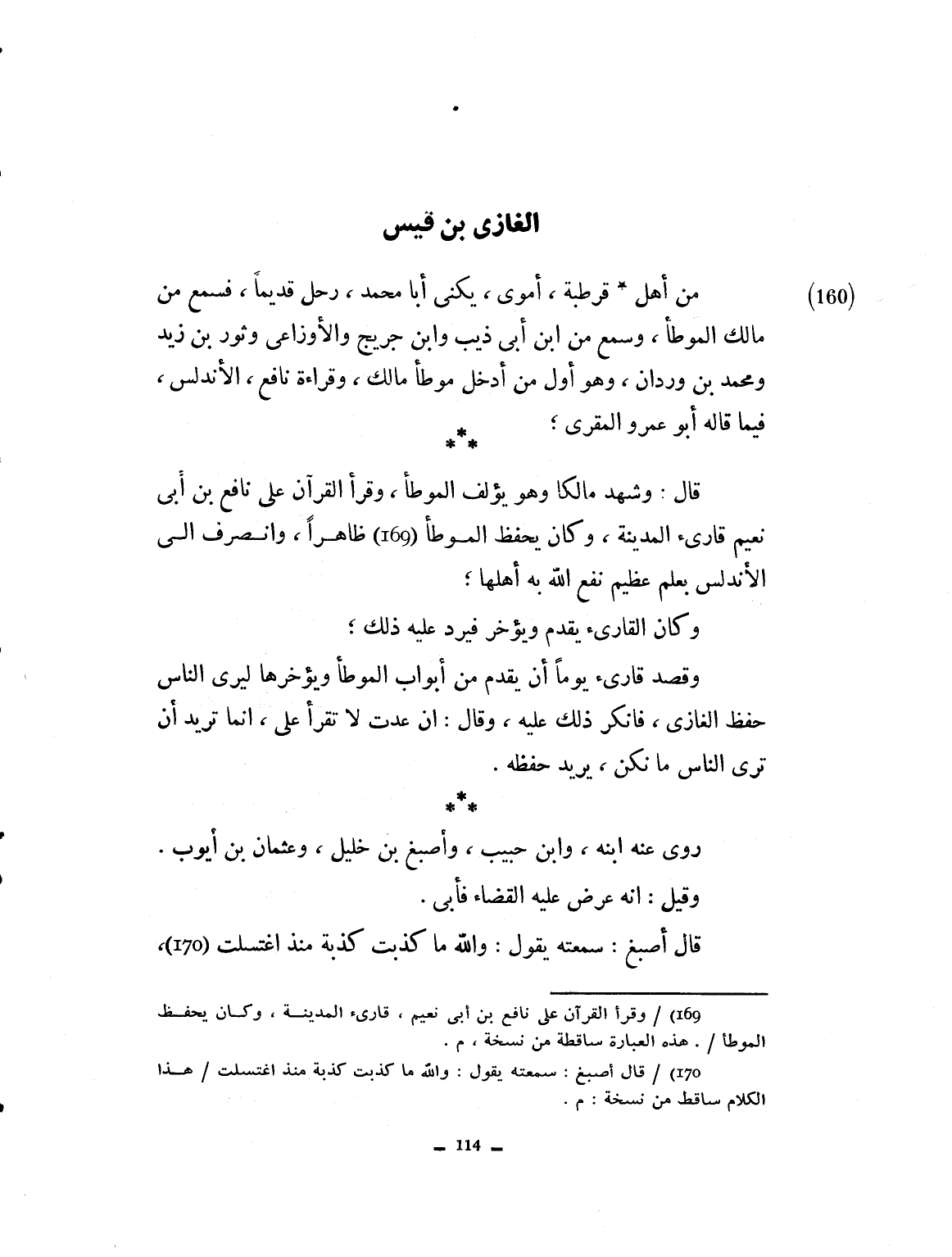 من أهل قرطبة. أموي يكنى أبا محمد. رحل قديماً فسمع من مالك الموطأ وسمع من ابن أبي ذئب وابن جريج والأوزاعي وثور بن يزيد ومحمد ابن وردان، وهو أول من أدخل موطأ مالك وقراءة نافع الأندلس فيما قاله أبو عمرو المقرىء. قال: وشهد مالكاً وهو يؤلف الموطأ ظاهراً، وانصرف إلى الأندلس بعلم عظيم، نفع الله به أهلها. وكان الغازي يقدم أو يؤخر فيرد عليه ذلك. وقصد قارئاً يوماً أن يقدم من أبواب الموطأ ويؤخرها، ليرى الناس حفظ الغازي فأنكر ذلك عليه، وقال إن عدت، لا تقرأ. إنما تريد أن تري الناس ما يكن يريد حفظه. روى عنه ابنه وابن حبيب وأصبغ بن خليل وعثمان بن أيوب، وقيل إنه عرض عليه القضاء فأبى. قال أصبغ: سمعته يقول: والله ما كذبت منذ اغتسلت