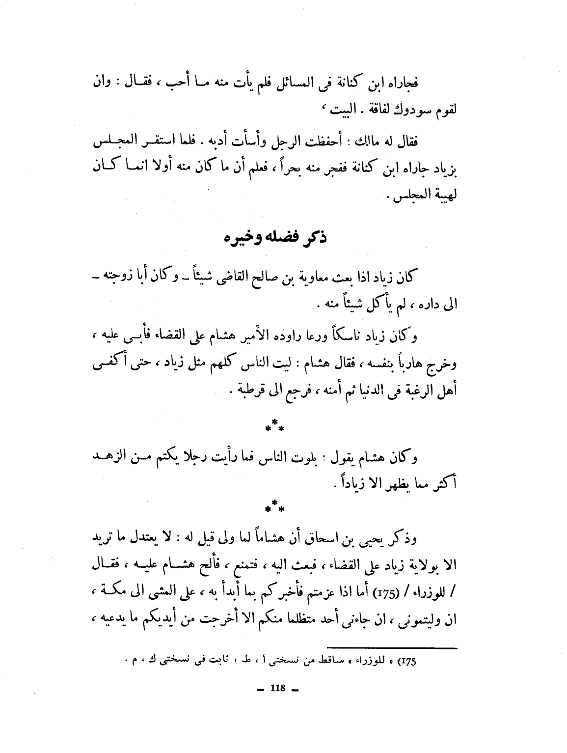 كان زياد إذا بعث معاوية بن صالح القاضي شيئاً وكان أبا زوجته إلى داره، لم يأكل شيئاً منه. وكان زياد ناسكاً ورعاً، رواه الأمير هشام على القضاء فأبى عليه وخرج هارباً بنفسه. فقال هشام: ليت الناس كلهم كزياد حتى أكفى أهل الرغبة في الدنيا. ثم أمنه فرجع إلى قرطبة، وكان هشام يقول: بلوت الناس فما رأيت رجلاً يكتم من الزهد أكثر مما يظهر إلا زياداً. وذكر يحيى بن إسحاق أن هشاماً لما ولي قيل له: لا يعتدل ما تريد، إلا بتولية زياد على القضاء. فبعث إليه فتمنع، فألح هشام عليه، فقال للوزراء: أما إذا عزمتم فأخبركم بما ابتدأ به، على المشي إلى مكة إن وليتموني إ، جاءني أحد متظلماً منكم إلا أخرجت من أيديكم ما يدعيه،