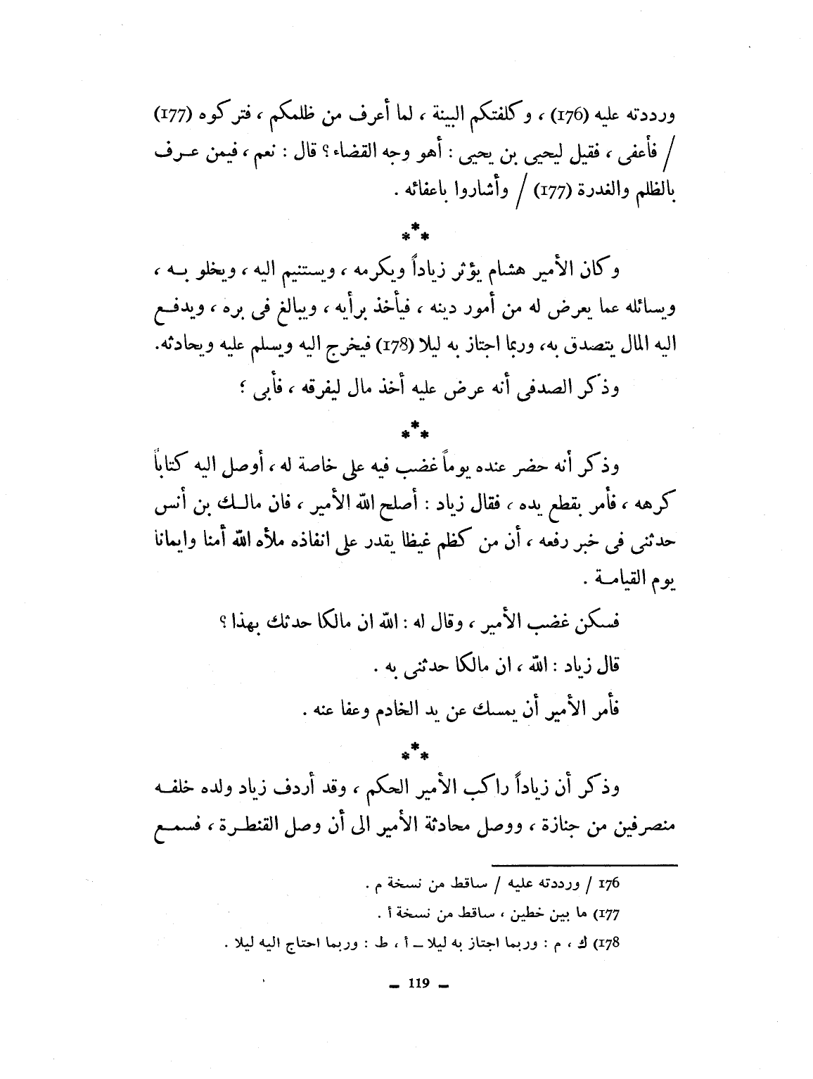 وذكر الصدفي: أنه عرض عليه أخذ مال ليفرقه فأبى. وذكر أنه حضر عنده يوماً غضب فيه على خاصة له، أوصل إليه كتاباً كرهه، فأمر بقطع يده، فقال زياد: أصلح الله الأمير. فإن مالك بن أنس حدثني في خبر رفعه إلى النبي صلى الله عليه وسلم، إن من كظم غيظاً يقدر على إنفاذه ولاه الله أمناً وإيماناً يوم القيامة. فسكن غضب الأمير، وقال له: أحسنت. إن مالكاً حدثك به. فأمر الأمير أن يمسك عن يد الخادم، وعفا عنه. وذكر أن زياداً راكب الأمير الحكم، وقد أردف زياد ولده خلفه، منصرفين من جنازة ووصل محادثته الأمير إلى أن وصل القنطرة، فسمع