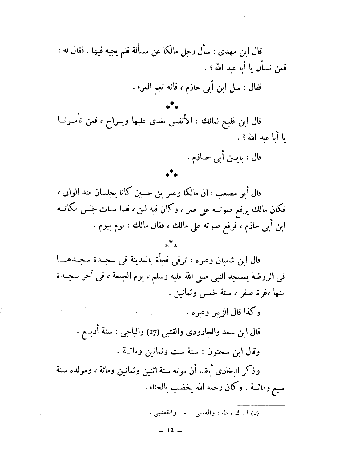 قال ابن مهدي: سأل رجل مالكاً عن مسألة فلم يجبه فيها، قال له: فمن نسأل يا أبا عبد الله؟ قال سل ابن أبي حازم، فإنه نعم المرء. قال ابن مليح لمالك الأنفس يقرى عليها ويراح فمن تأمرنا يا أبا عبد الله؟ قال: بابن أبي حازم. وقال أبو مصعب: إن مالكاً وعمر بن حسين كانا يجلسان عند الوالي فكان يرفع صوته على مالك، فقال مالك يوم بيوم. قال ابن شعبان وغيره: توفى فجأة بالمدينة في سجدة سجدها بالروضة بمسجد النبي صلى الله عليه وسلم يوم الجمعة، في آخر سجدة منها غرة صفر سنة خمس وثمانون وكذا قال الزبيري وغيره. قال ابن سعد الجارودي والقعنبي والباجي: سنة أربع. قال ابن سحنون سنة ست وثمانين ومائة. وذكر البخاري أيضاً أن موته سنة اثنتين وثمانين ومائة، ومولده سنة سبع ومائة وكان رحمه الله يخضب بالحناء.