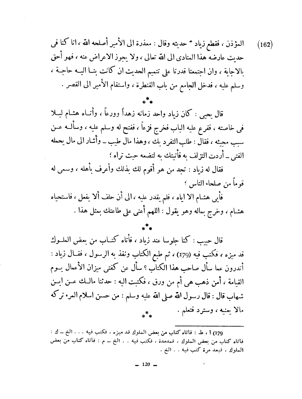 المؤذن فقطع زياد حديثه وقال: معذرة إلى الأمير أصلحه الله، إنا كنا في حديث عارضه هذا المنادي إلى الله تعالى. ولا يجوز الإعراض عنه، فهو أحق بالإجابة وإن اجتمعنا قدرنا على تتميم الحديث إن كانت بنا إليه حاجة. وسلم عليه فدخل الجامع من باب القنطرة واستقام الأمير إلى القصر. قال يحيى: كان زياد واحد زمانه، زاهداً ورعاً وأتاه هشام ليلاً في خاصته فقرع عليه الباب فخرج فعرف به، ففتح له وسلم عليه، وسأله عن سبب مجيئه، فقال: طلب التفرد بك، وهذا مال طيب وأشار إلى مال يحمله الفتى أردت التزلف به فأتيتك به لتضعه حيث تراه. فقال له زياد: تجد من هو أقوم لك بذلك وأعرف بأهله. وسمى له قوماً من صلحاء الناس، فأبى هشام إلا إياه، فلم يقدر عليه إلى أن حلف أن له بفعل. فاستحياه هشام وخرج بماله، وهو يقول: اللهم أعني على طاعتك بمثل هذا. قال حبيب: كنا جلوساً عند زياد فأتاه كتاب من بعض الملوك بعد مدة، فكتب فيه ثم طبع الكتاب ونفذ به الرسول. فقال زياد أتدرون عم سأل صاحب هذا؟ سأل عن كفتي ميزان الأعمال يوم القيامة، من ذهب هي أم من ورق؟ فكتبت إليه، حدثنا مالك عن ابن شهاب، قال: قال رسول الله صلى الله عليه وسلم من حسن إسلام المرء تركه ما لا يعنيه.