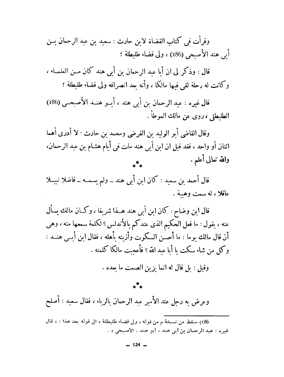 وقرأت في كتاب القضاة لابن حارث: سعيد بن عبد الرحمان بن أبي هند، أبو هند الأصبحي الطليطلي روى عن مالك الموطأ. وقال القاضي أبو الوليد بن الفرضي ومحمد بن حارث: لا أدري، أهما اثنان أم واحد. فقد قيل لي، أن ابن أبي هند مات في أيام هشام بن عبد الرحمان، والله تعالى أعلم. قال أحمد بن سعيد: كان ابن أبي هند ولم يسمه، فاضلاً نبيلاً عاقلاً، له همة وهيبة. قال ابن وضاح: كان ابن أبي هند هذا شريفاً، وكان مالك يسأل عنه، يقول: ما فعل الحكيم عندكم بالأندلس لكلمة سمعها منه، وهي: إن قال مالك يوماً ما أحسن السكوت وأزينه بأهله. فقال ابن أبي هند: وكل من شاء سكت يا أبا عبد الله. فأعجبت مالكاً كلمته. وقيل بل قال له: إ، ما نزين الصمت ما بعده. وعرض به رجل عند ألأمير عبد الرحمان بالرياء. فقال سعيد: اصلح