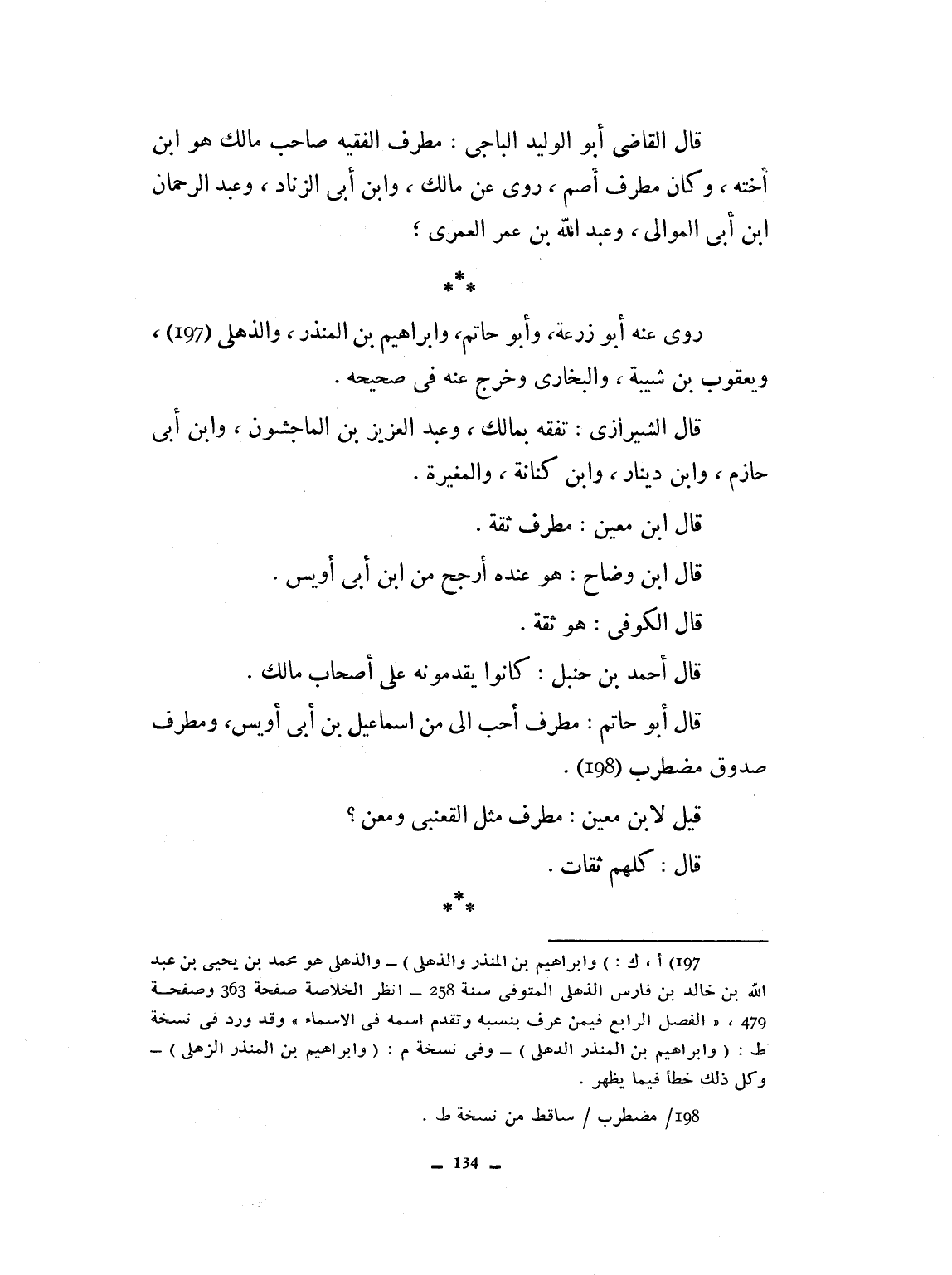 قال القاضي أبو الوليد الباجي: مطرف الفقيه صاحب مالك، هو ابن أخته، وكان مطرف أصم. روى عن مالك وان أبي الزناد وعبد الرحمان بن أبي المولى وعبد الله بن عمر العمري، وروى عنه أبو زرعة وأبو حاتم وإبراهيم بن المقدر والذهلي ويعقوب بن شيبة والبخاري، وخرج عنه في صحيحه. قال الشيرازي: تفقه بمالك، وعبد العزيز ابن الماجشون وابن أبي حازم وابن دينار وابن كنانة والمغيرة. قال ابن معين: مطرف ثقة. قال ابن وضاح: هو عنده ارجح من ابن أبي أويس. قال الكوفي هو ثقة. قال أحمد بن حنبل كانوا يقدمونه على أصحاب مالك. قال أبو حاتم: مطرف أحب إلي من إسماعيل بن أبي أويس، ومطرف صدوق، مضطرب. قيل لابن معين: مطرف مثل العقباني ومعن؟ قال: كلهم