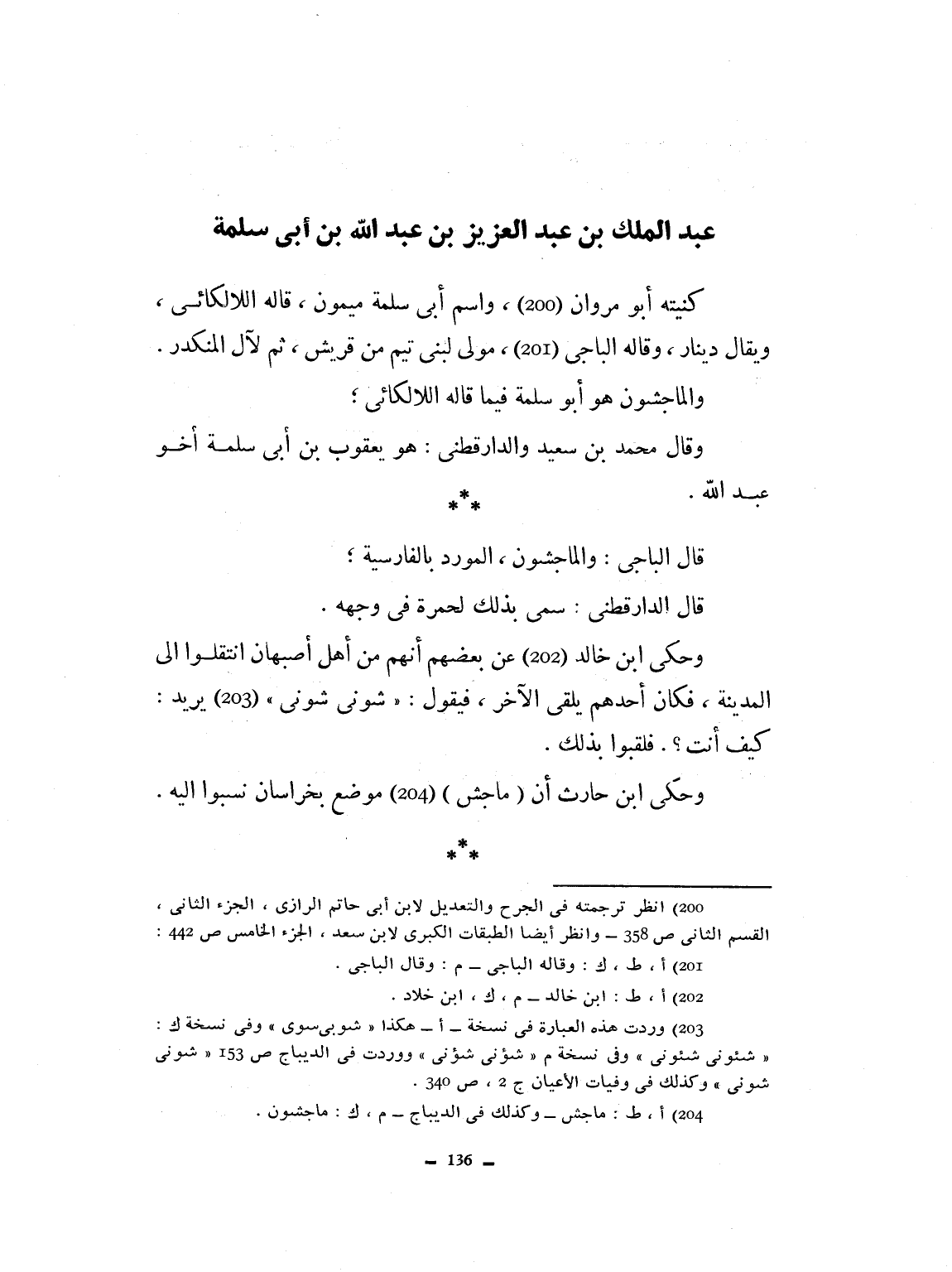 ابن عبد الملك بن عبد العزيز بن أبي سلمة كنيته أبو مروان واسم أبي سلمة ميمون. قاله الألكاني. ويقال دينار، وقال الباجي: مولى بني تميم من قريش. ثم لآل المنكدر. والماجشون هو أبو سلمة فيما قاله الألكاني. وقال محمد بن سعد والدارقطني: هو يعقوب بن أبي سلمة، أخو عبد الله. قال الباجي: والماجشون المورد، بالفارسية. قال الدارقطني: سمي بذلك لحمرة في وجهه. وحكى ابن خلاد أن أحدهم يلقى الآخر يقول: شؤون، شؤون يعني كيف أنت. فلقبوا بذلك. وحكى ابن حارث: أن ماجشون موضع بخراسان نسبوا إليه،