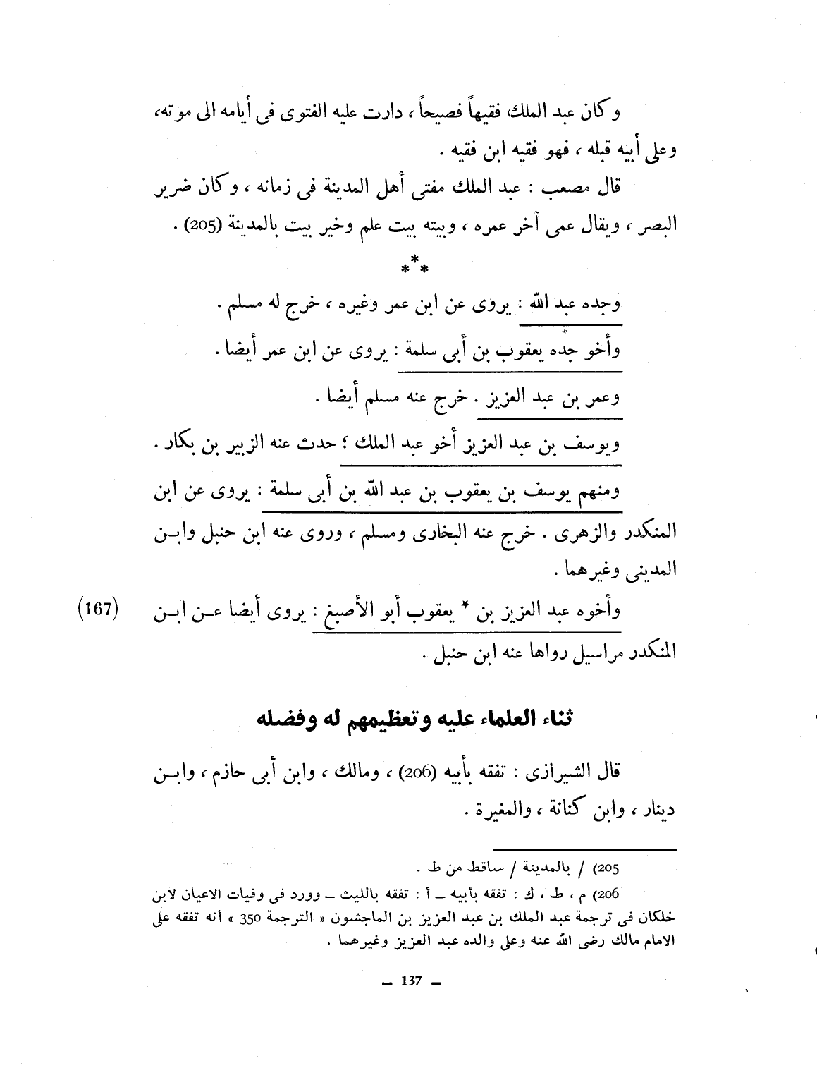 وكان عبد الملك فقيهاً فصيحاً، دارت عليه الفتوى في أيامه إلى موته، وعلى أبيه قبله فهو فقيه ابن فقيه. قال مصعب: عبد الملك مفتي أهل المدينة في زمانه. وكان ضرير البصر، ويقال عمي آخر عمره. وبيته بيت علم وخير بيت بالمدينة، وجده عبد الله يروي عن ابن عمر وغيره، خرج له مسلم. وأخو جده يعقوب بن أبي سلمة يروي عن ابن عمر أيضاً، وعمر بن عبد العزيز. خرج عنه مسلم أيضاً، ويوسف بن عبد العزيز أخو عبد الملك حدث عنه الزبير ابن بكار، ومنهم يوسف بن يعقوب بن عبد الله وأبي سلمة يروي عن ابن المنكدر الزهري، خرج عنه البخاري ومسلم، وروى عنه ابن حنبل وابن المديني وغيرهما، وأخوه عبد العزيز بن يعقوب أبو الأصبغ يروري أيضاً عن ابن المنكدر مراسيل رواها عنه ابن حنبل.