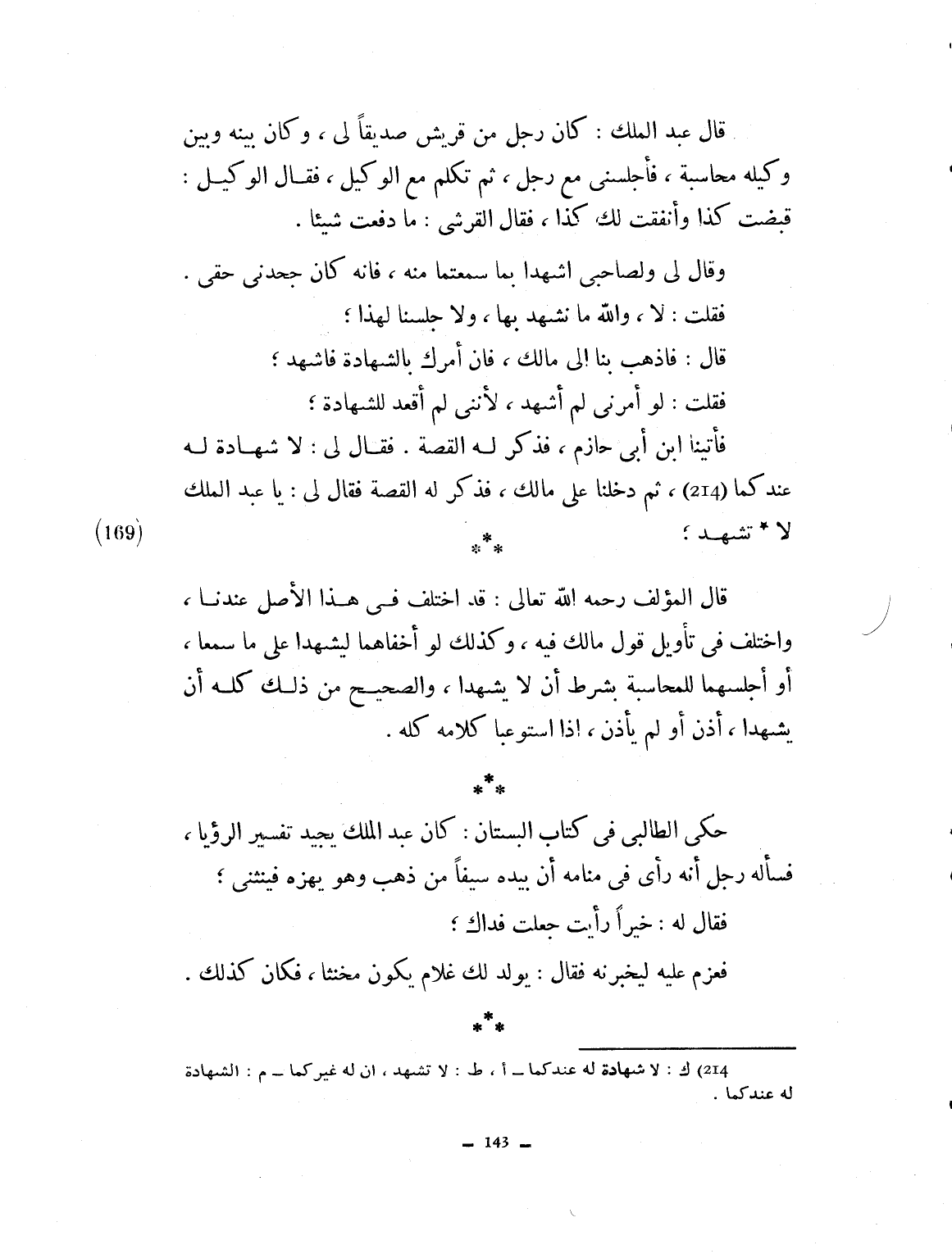 قال عبد الملك كان رجل من قريش صديقاً لي وكان بينه وبين وكيله محاسبة، فأجلسني مع رجل ثم تكلم مع الوكيل فقال الوكيل: قبضت كذا، ودفعت لك كذا. فقال القرشي: ما دفع إلي شيئاً. وقال لي ولصاحبي اشهد بما سمعتا منه، فإنه كان حجزني حقي. فقلت له: والله ما نشهد لهذا، ولا جلسنا لهذا. قال فاذهب بنا إلى مالك فإن أمر لي بالشهادة فاشهد. فقلت: لو أمرني لم اشهد لأخي. لم أقعد للشهادة. فأتينا ابن ابي حازم فذكر له القصة. فقال لي: الشهادة له عندكما. ثم دخلنا على مالك فذكر له القصة. فقال لي: يا عبد الملك لا تشهد. قال المؤلف رحمه الله تعالى: قد اختلف في هذا الأصل عندنا، واختلف في تأويل قول مالك فيه. وكذلك لو أخفاهما ليشهدا على ماسمعا، أو أجلسهما للمحاسبة بشرط أن لا يشهدا، والصحيح من ذلك كله أن يشهد أذن أو لم يأذن، إذا استوعبا كلامه كله. حكى المطالبي في كتاب البستان: كان عبد الملك يجيد تفسير الرؤيا، فسأله رجل أنه رأى في منامه أن بيده سيفاً من ذهب وهو يهزه وينثني. فقال له خيراً رأيت، جعلت فداك. فعزم عليه ليخبرنه. فقال يولد لك غلام يكون مخنثاً. فكان كذلك.