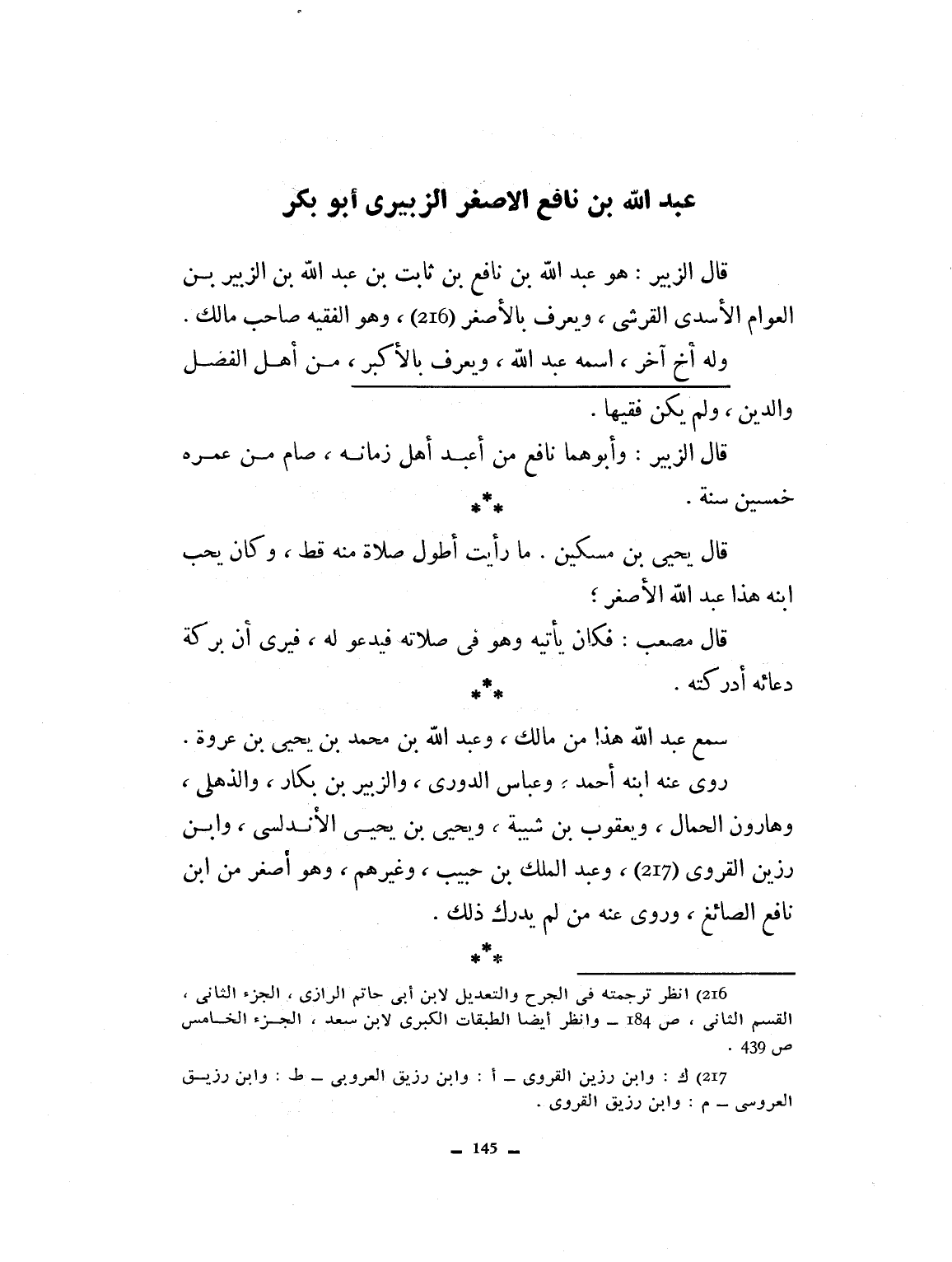 أبو بكر. قال الزبيري: هو عبد الله بن نافع بن ثابت بن عبد الله ابن الزبير بن العوام الأسدي القرشي، ويعرف بالأصغر وهو الفقيه صاحب مالك وله أخ آخر اسمه عبد الله، ويعرف بالأكبر. من أهل الفضل والدين ولم يكن فقيهاً. قال الزبير وأبوهما نافع، من أعبد أهل زمانه. صام من عمره خمسين سنة. قال يحيى بن مسكين ما رأيت أطول صلاة منه قط. وكان يحب ابنه هذا عبد الله الأصغر. قال مصعب: فكان يأتيه في صلاة فيدعو له، فيرى أن بركة دعائه أدركته. سمع عبد الله هذا من مالك وعبد الله بن محمد بن يحيى بن عروة. روى عنه ابنه أحمد وعباس الدوري والزبير بن بكار والذهلي وهارون الجمال ويعقوب بن شيبة ويحيى ابن يحيى الأندلسي وابن رزين القروي، وعبد الملك بن حبيب وغيرهم، وهو أصغر من ألن نافع الصائغ، وروى عنه من لم يدرك ذلك.