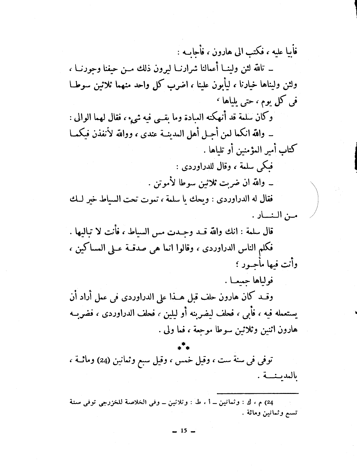 فأبيا عليه، فكتب إلى هارون فأجابه: تالله لئن ولينا أعمالنا أشرارنا ليرون ذلك من حيفنا وجورنا، ولئن وليناها خيارنا ليأبون علينا. اضرب كل واحد منهم ثلاثين سوطاً في كل يوم حتى يلياها. وكان سلمة قد أنهكته العبادة وما بقي فيه شيء، فقال لهما الوالي: والله إنكما لمن أجل أهل المدينة عندي، والله لأنفذن فيكما كتاب أمير المؤمنين أو تليانها. فبكى سلمة، وقال الدراوردي: والله إن ضربت ثلاثين سوطاً لأموتن. فقال له الدراوردي: ويحك يا سلمة تموت تحت السياط خير لك من النار. فقال سلمة: إنك والله قد وجدت مس السياط، فأتت لا تباليها. فكلم الناس الدراوردي، وقالوا إليه: إنما هي صدقة على المساكين وأنت فيها مأجور فولياها جميعاً، وقد كان هارون حلف على الدراوردي قبل هذا في عمل أراد أن يستعمله فيه فأبى فحلف ليضربنه أو ليلين، فحلف الدراوردي فضربه اثنين وثلاثين سوطاً موجعة فما ولي. توفى سنة ست وقيل خمس وقيل سبع وثمانين ومائة بالمدينة.