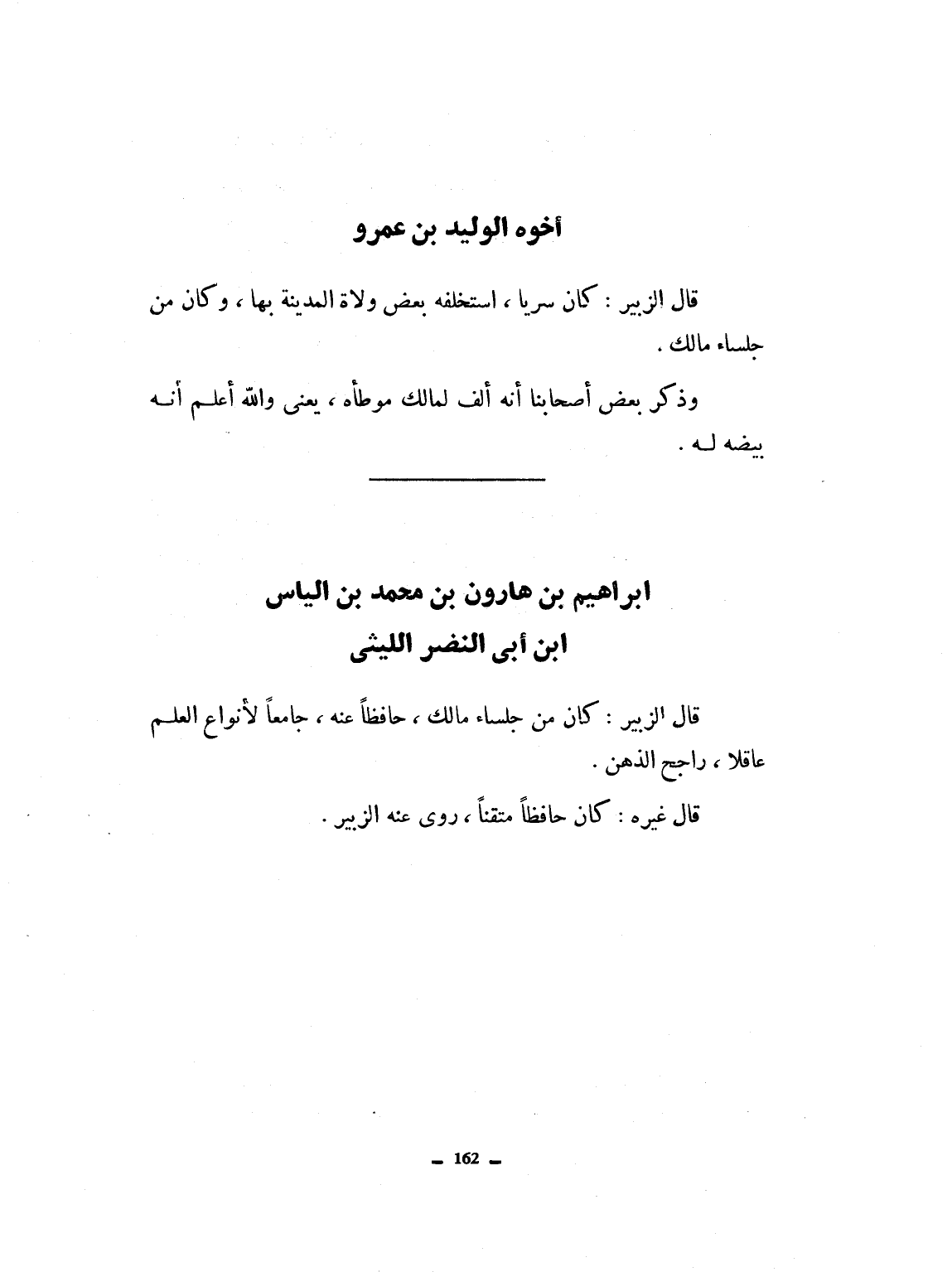 قال الزبير: كان سرياً استخلفه بعض ولاة المدينة بها. وكان من جلساء مالك. وذكر بعض أصحابنا أنه ألف لمالك كتابه، موطأه. يعني - والله أعلم - بيضه له.