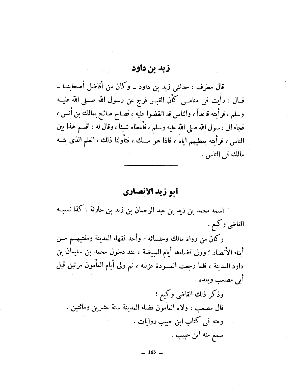 اسمه محمد بن زيد بن عبد الرحمن بن زيد بن حارثة كذا نسبه القاضي وكيع. وكان من رواة مالك وجلسائه وأحد فقهاء المدينة ومفتيهم من ابناء الأنصار، وولي قضاءها أيام المبيضة عند دخول محمد بن سليمان بن داود المدينة فلما رجعتها المسودة عزلته، ثم ولي أيام المأمون مرتين قبل أبي مصعب وبعده. ذكر ذلك القاضي وكيع. قال: ولاه المأمون قضائ المدينة سنة عشرين ومائتين وعنه في كتاب ابن حبيب روايات. سمع منه ابن حبيب.